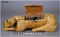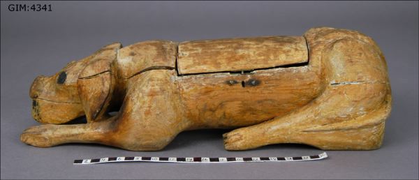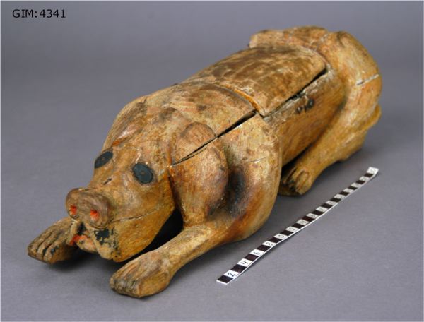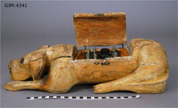 Kristallmottagare inbyggd i skulpterad hund av trä. Tillverkad av HJH, troligtvis 1920-tal.