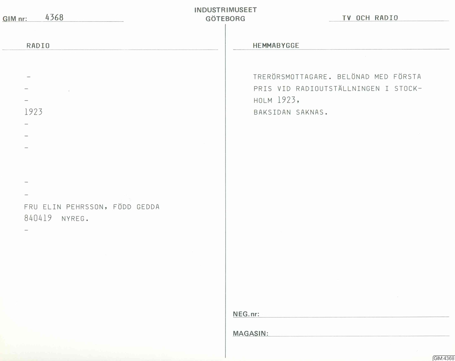 - Rundradiomottagare trerörsmottagare. Belönad med första pris vid radioutställningen i Stockholm 1923. LV-MV. Trächassie. Rör och reglage monterade på utsidan av den lutande fronten. Bakstycke saknas. Skador: repor runt om. En bakelitratt defekt. Hemmabygge.