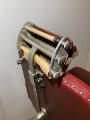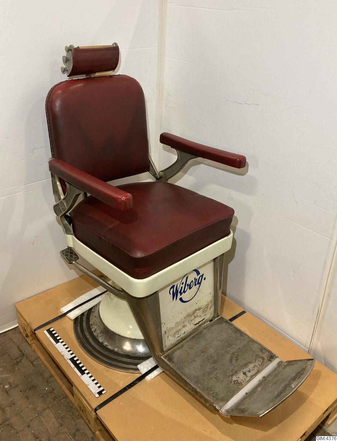 - Stolen höj och sänkbar, hydralisk på pelare. Ryggstödet ställbart, nackstödet höj och sänkbart. Nackstödet har utbytbart skyddspapper på rulle. Stolen i vitlackad metall och röd galon på säte, ryggstöd och armstöd.