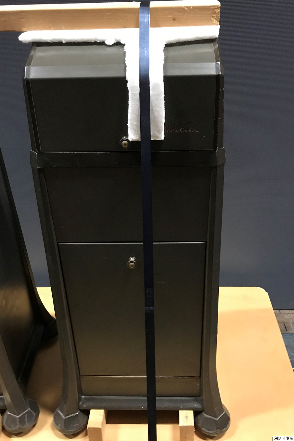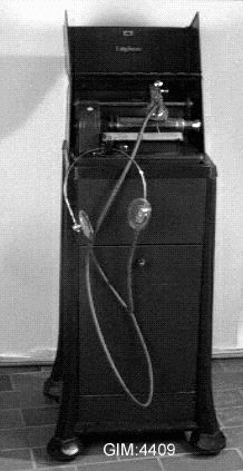 Avspelningsapparat(se GIM 4408) i huvförsett metallskåp på hjul, hörlurar i gul transparent plast med reglerbar huvudbåge i metall, gummislang, tillv nr T342413