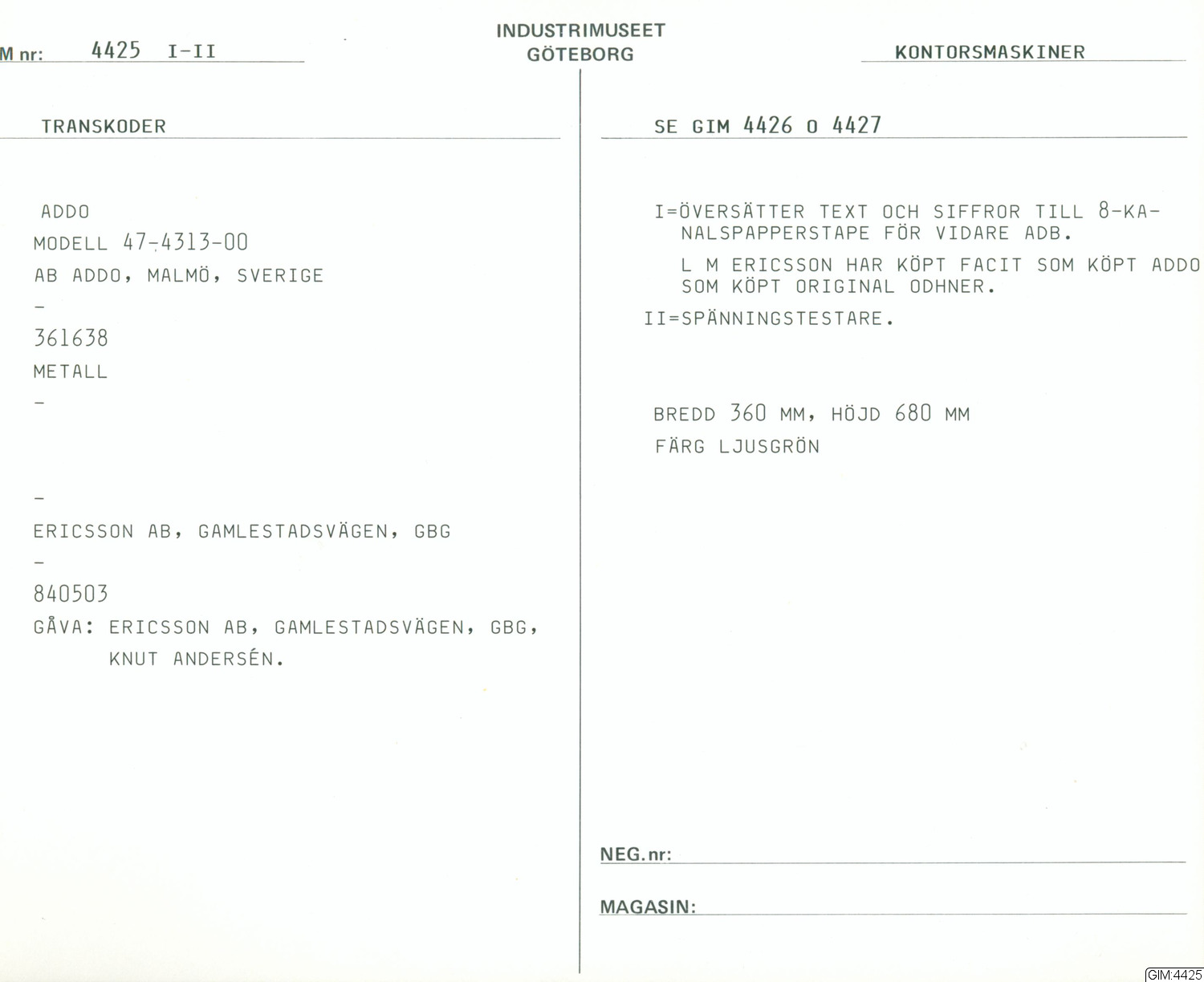 Översätter text och siffror till 8-kanals papperstape för vidare ADB. LM Ericsson har köpt Facit som köpt Addo som köpt Orginal Odhner.