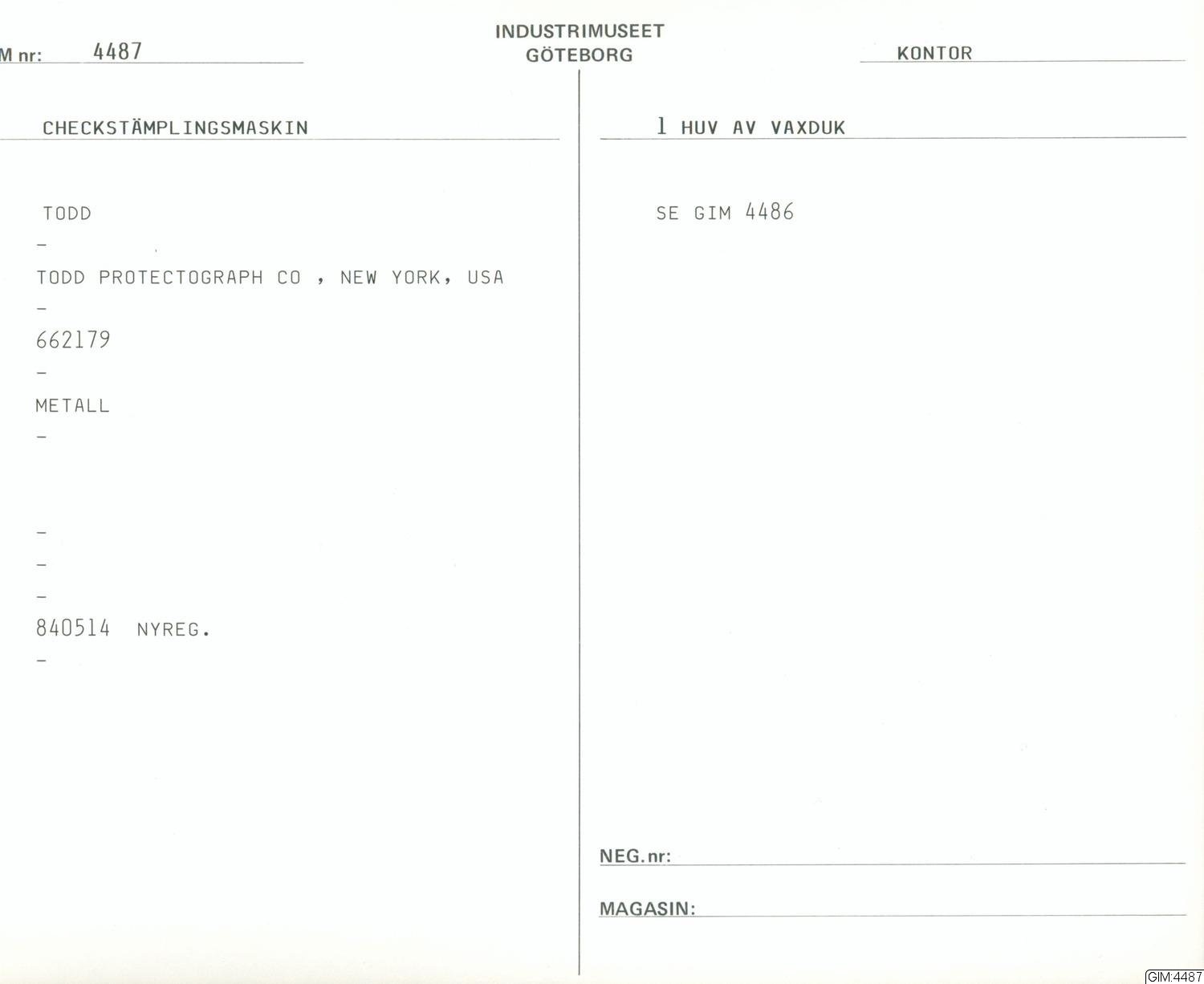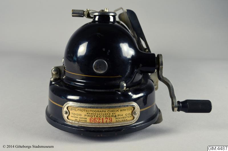 Se GIM 4486; Checkstämplingsmaskin tillverkad av Todd Protectograph Co. Gåva till Industrimuseet 1984.