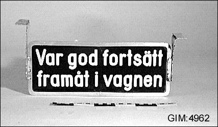 Skylt av plåt med texten "Var god fortsätt framåt i vagnen"