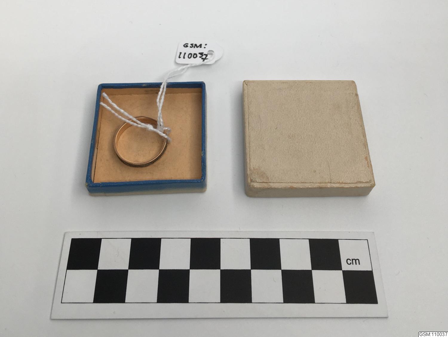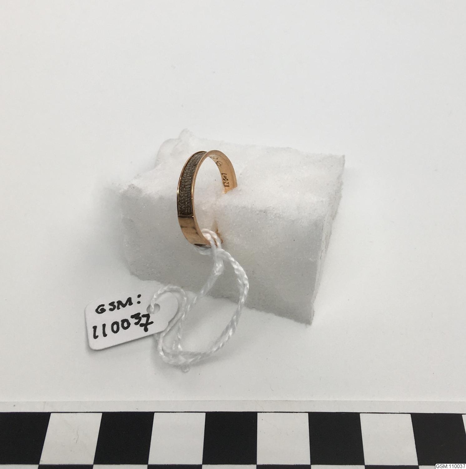 Ring i 18 karats guld, stämplad i Karlskrona 1836. Utförd av juvelerare Carl Neuendorff d ä. I ringskenan infällt hårarbete.