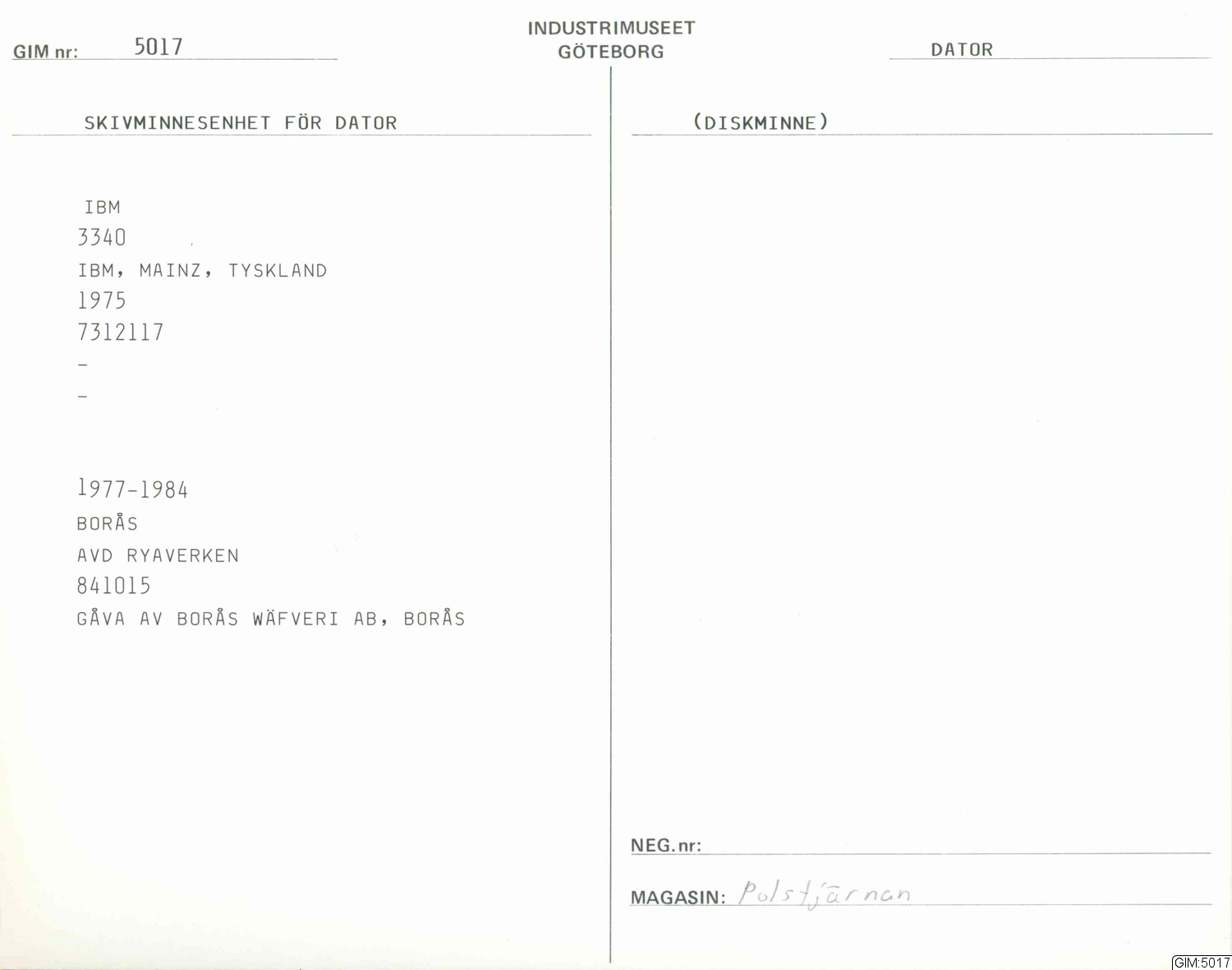 - Består av 1 dator placerad på egen pall, samt 1 skrivenhet för dator med 2 band i fodral, samt skivor och skivenhet. Totalt 5 delobjekt till skivminnesenheten.
