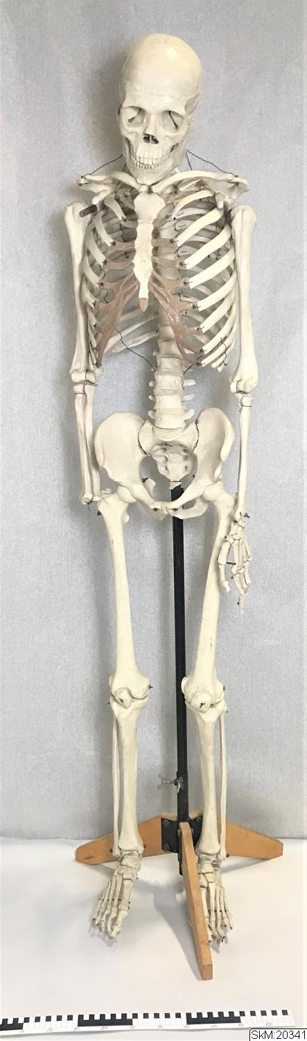 Modell av människoskelett i naturlig storlek. Skelettet är monterat på ett golvstativ.