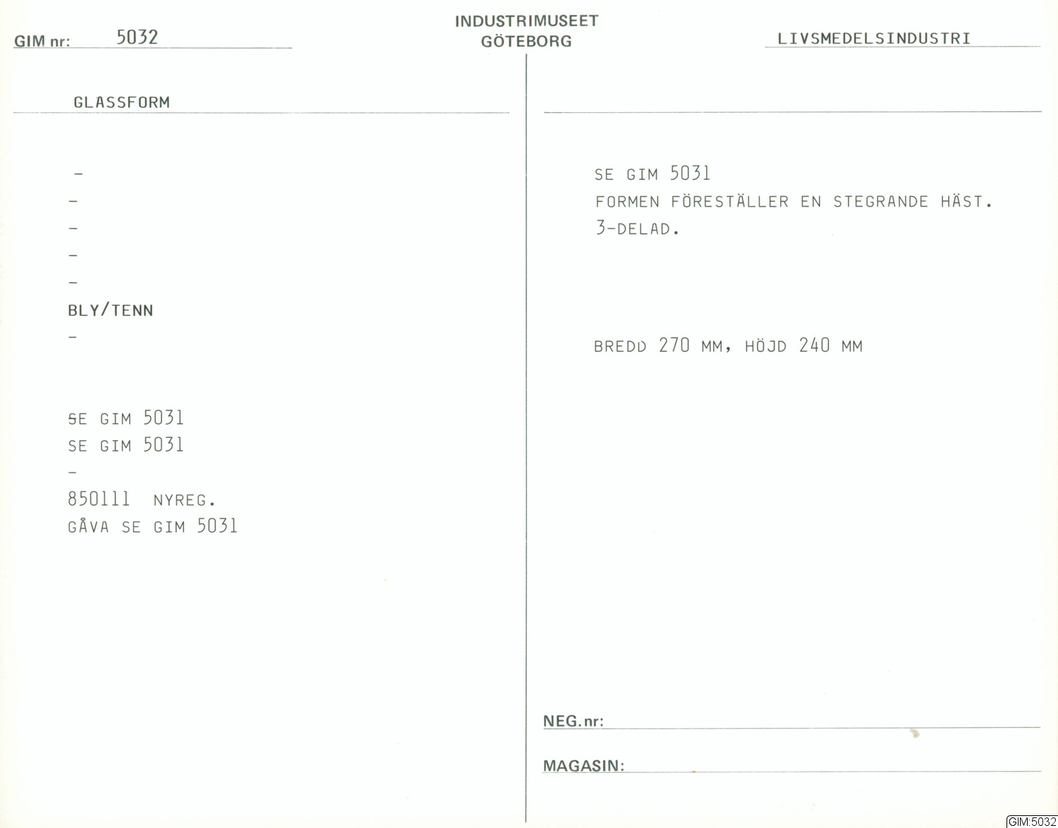 - Glassform av bly och tenn. Används till gjutning av glass. Föreställer en stegrande häst. Den är tredelad. Föremålet användes till en sommarsutställning om glass, gjord av kanslist Ulla Svanberg på GIM.