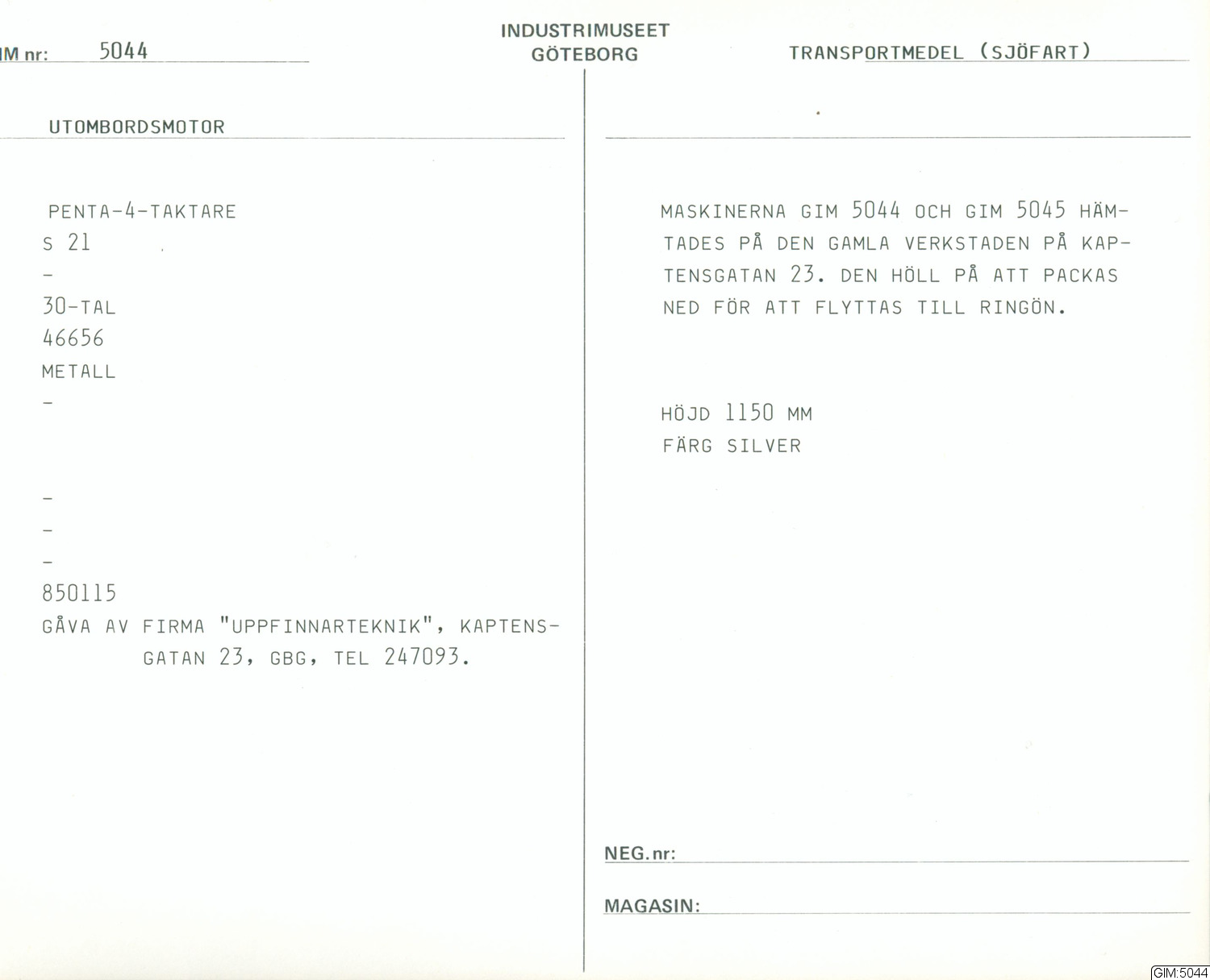 Silverfärgad metall. Maskinerna GIM 5044 GIM 5045. Hämtades på den gamla verkstaden på Kaptensgatan 23. Den höll på att packas ned för att flyttas till Ringön.