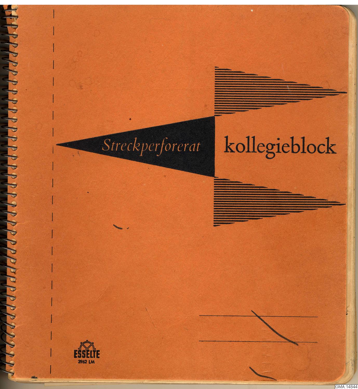 Anteckningsblock (linjerat) A5 format med arbetsanteckningar kring dräktutställningen som öppnade 1965. Alla sidor med någon form av text har scannats in. Sist i denna ämnesordnade handling finns en lös sida som låg inne i blocket denna sida är olinjerad. Utifrån de olika pennor och handstilarna som syns kan man anta att blocket avänts av olika peroner som arbetat med dräktutställningen. intill somliga textavsnitt finns summariska skisser av föremål. Prefix i inventarienummren förefaller ha hoppats över när anteckningarna gjordes.