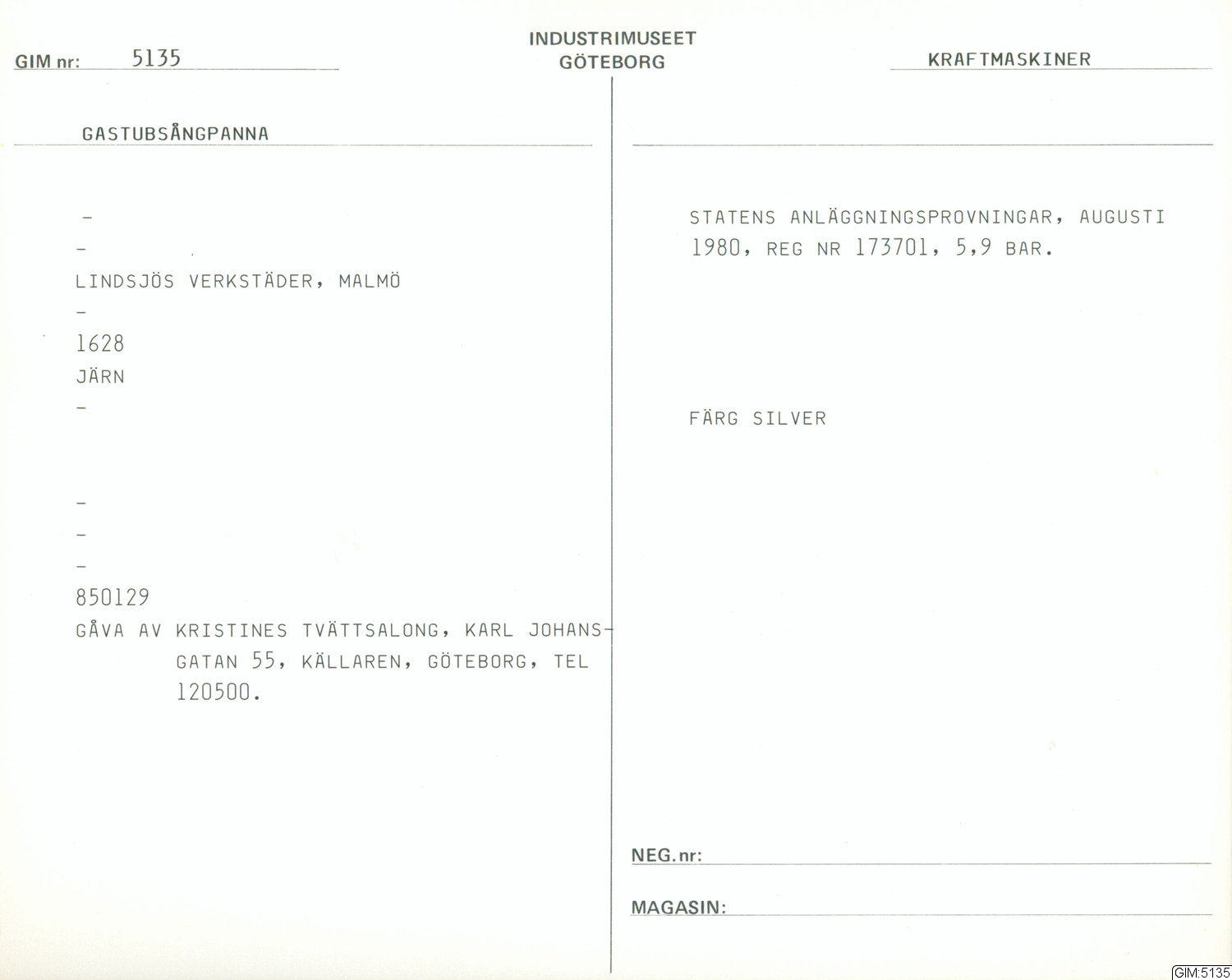 Statens Anläggningsprovningar Augusti 1980. Registrerings nr: 17 3701. 5,9 Bar. Silverfärgad