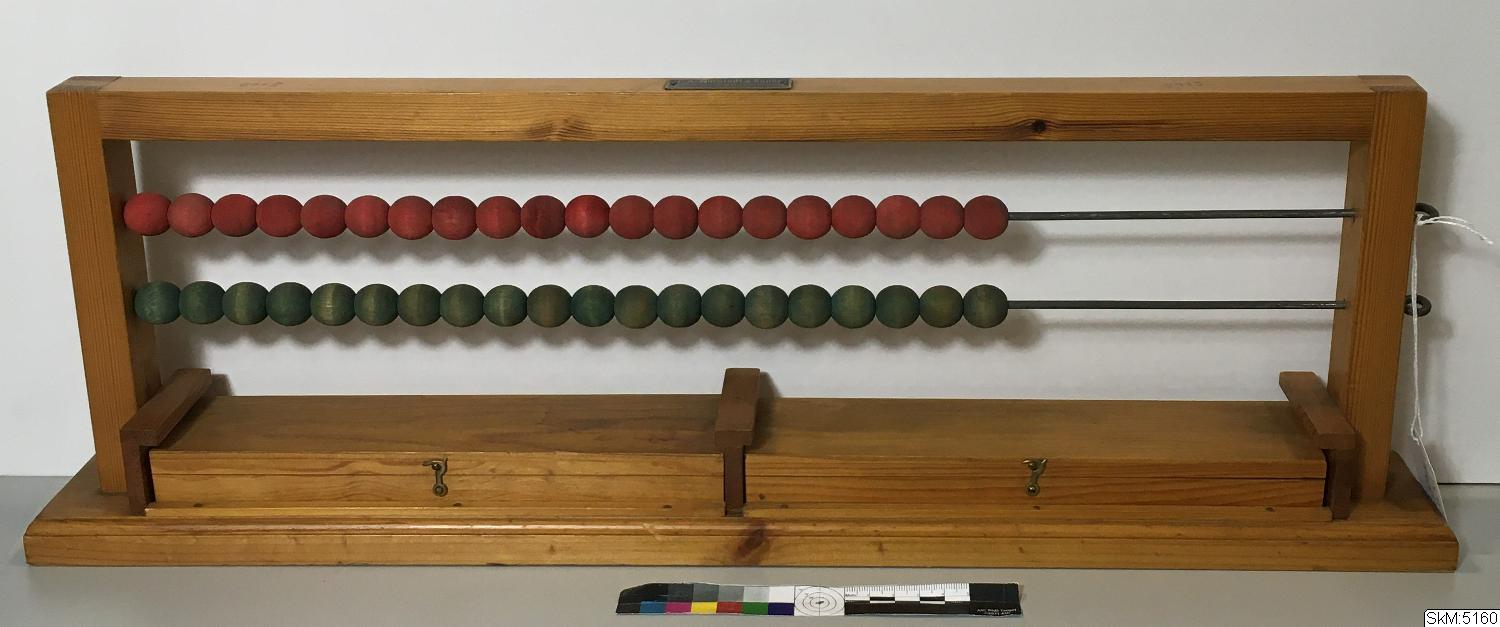 P.A. Norstedts och söner, Stockholm; Räkneredskap i trä med 20 rödfärgade och 20 grönfärgade kulor på två rader. 2 lådor finns i bordstativet.