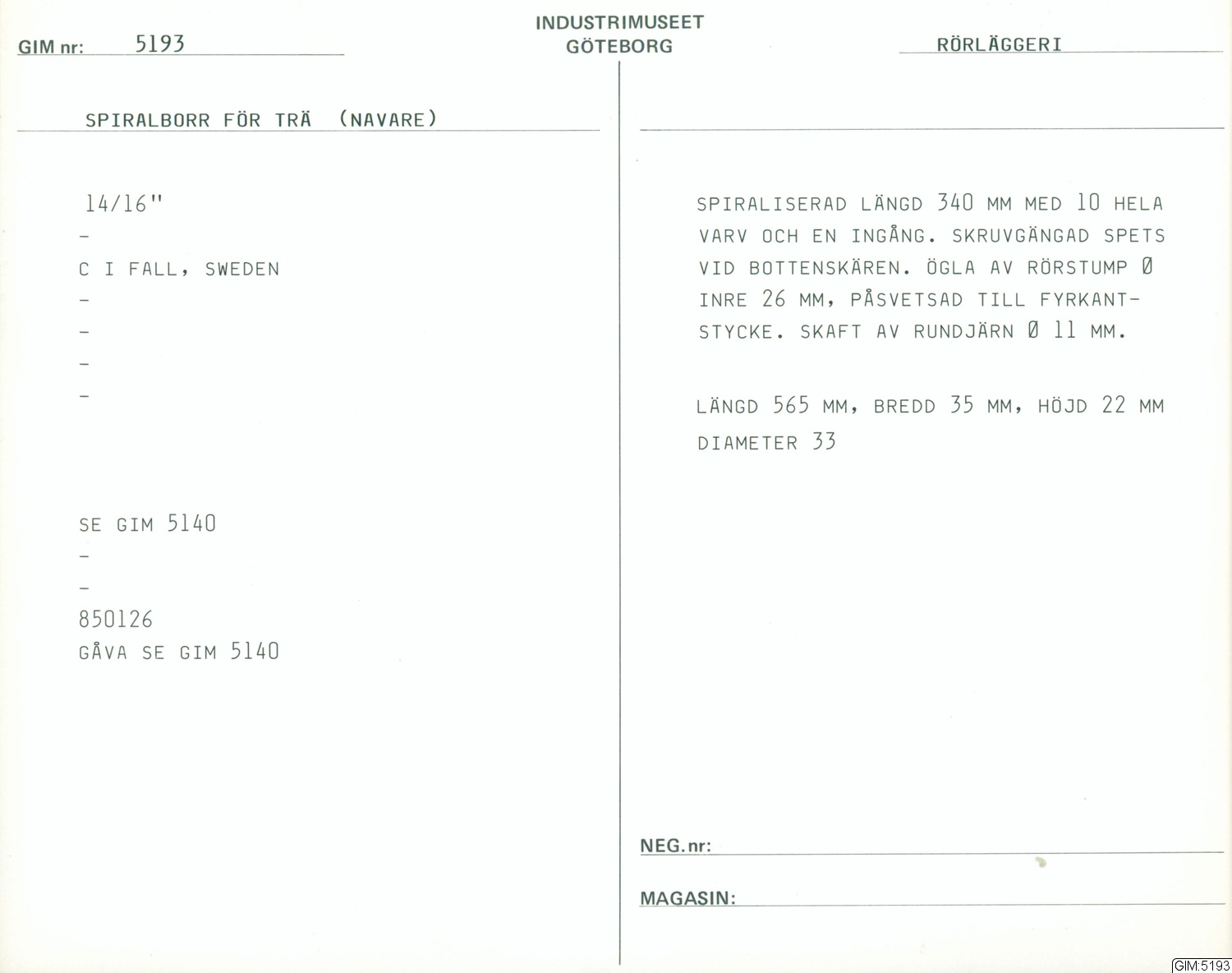 - Spiralborr för trä. (S.K Navare). Spiraliserad längd 34 cm med 10 hela varv och en ingång. Skruvgängad vid bottenskären. Ögla av rör-stump där inner diam är 2,6 cm, påsvetsad till fyrkantstycke. Skaft av rundjärn 1,1 cm i diam.