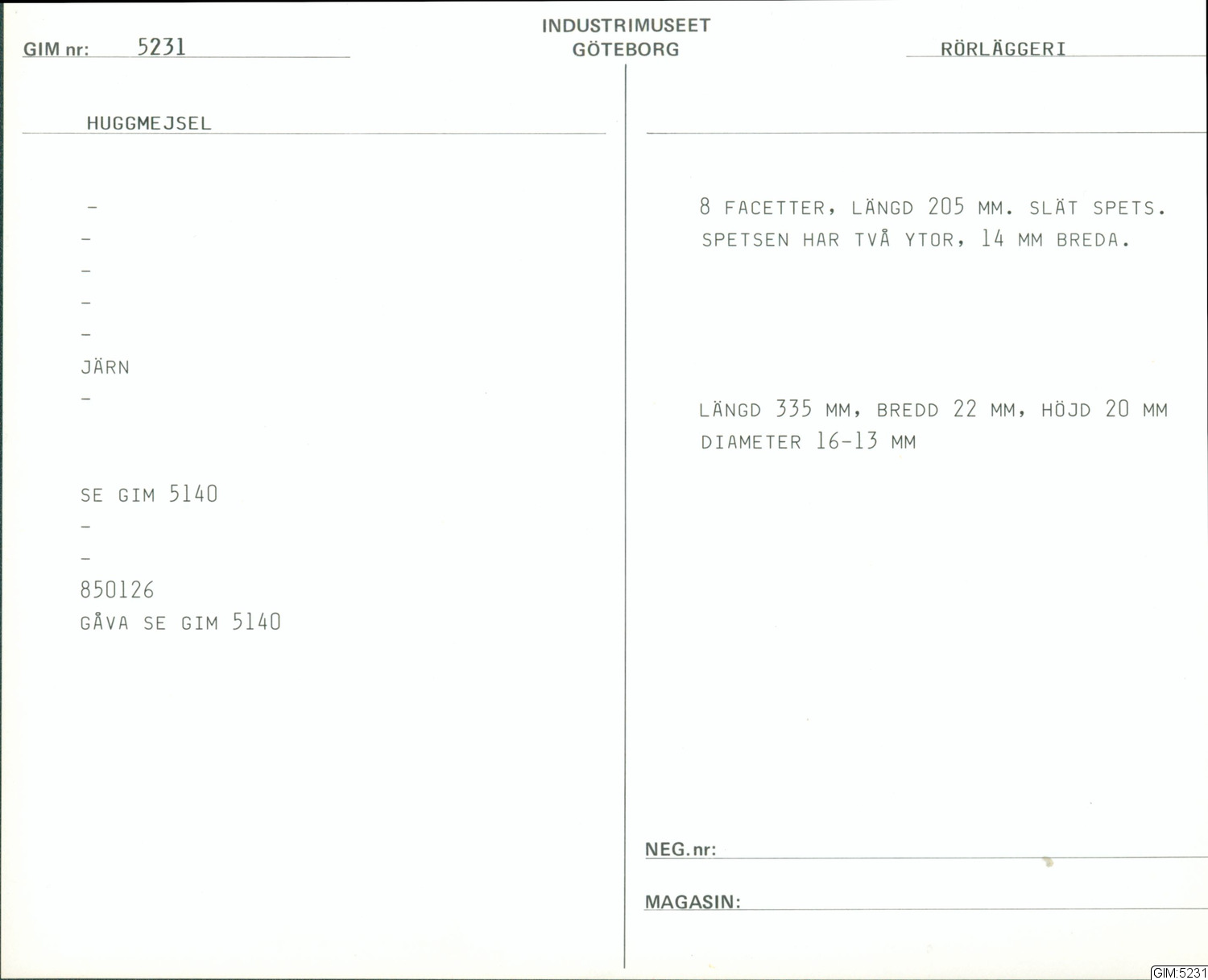 Hugg-mejsel med 8 facetter, längd 20,5 cm. Slät spets. Spetsen har två ytor som båda är 1,4 cm breda.