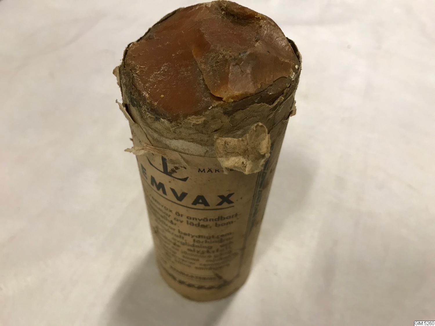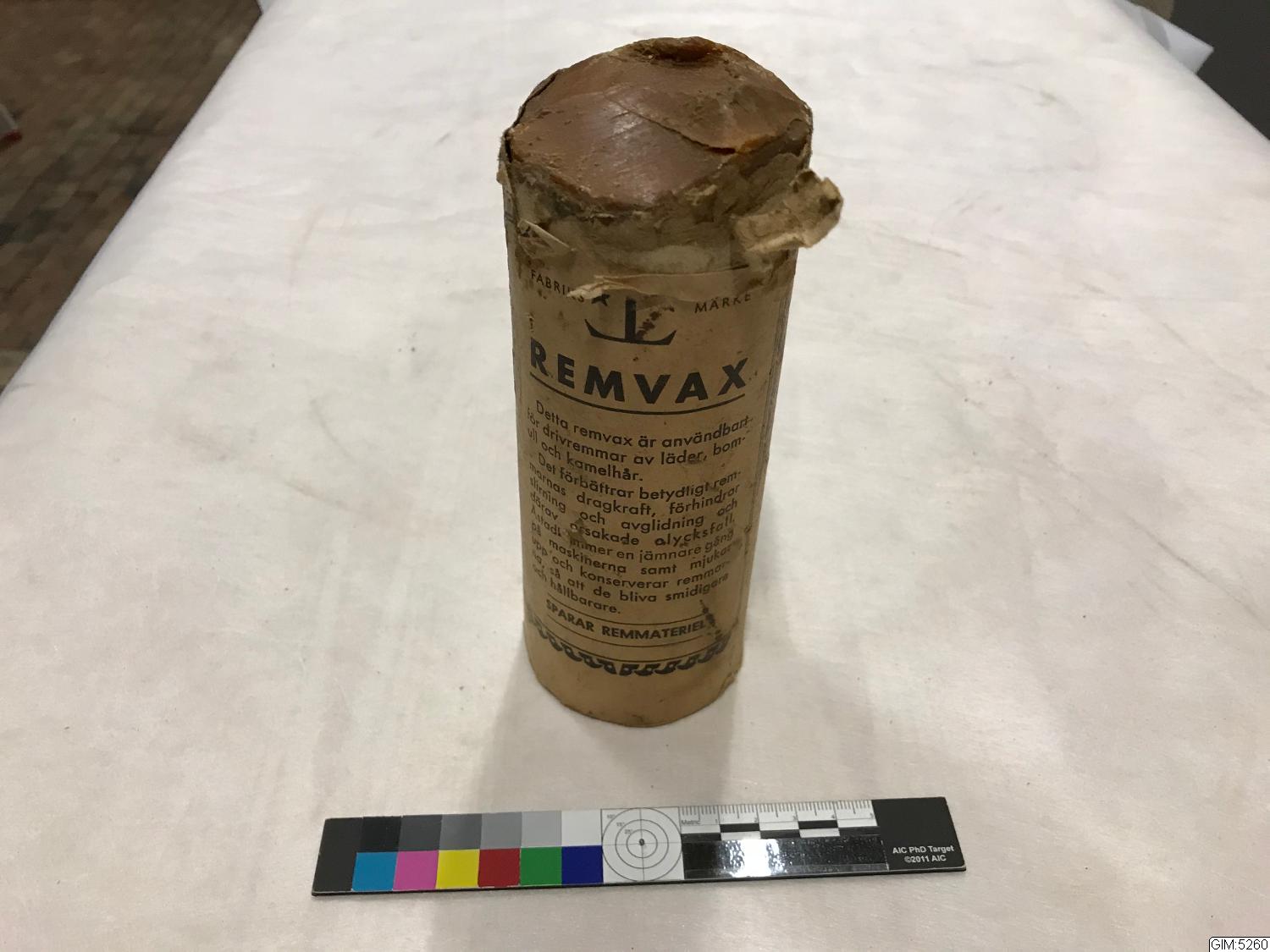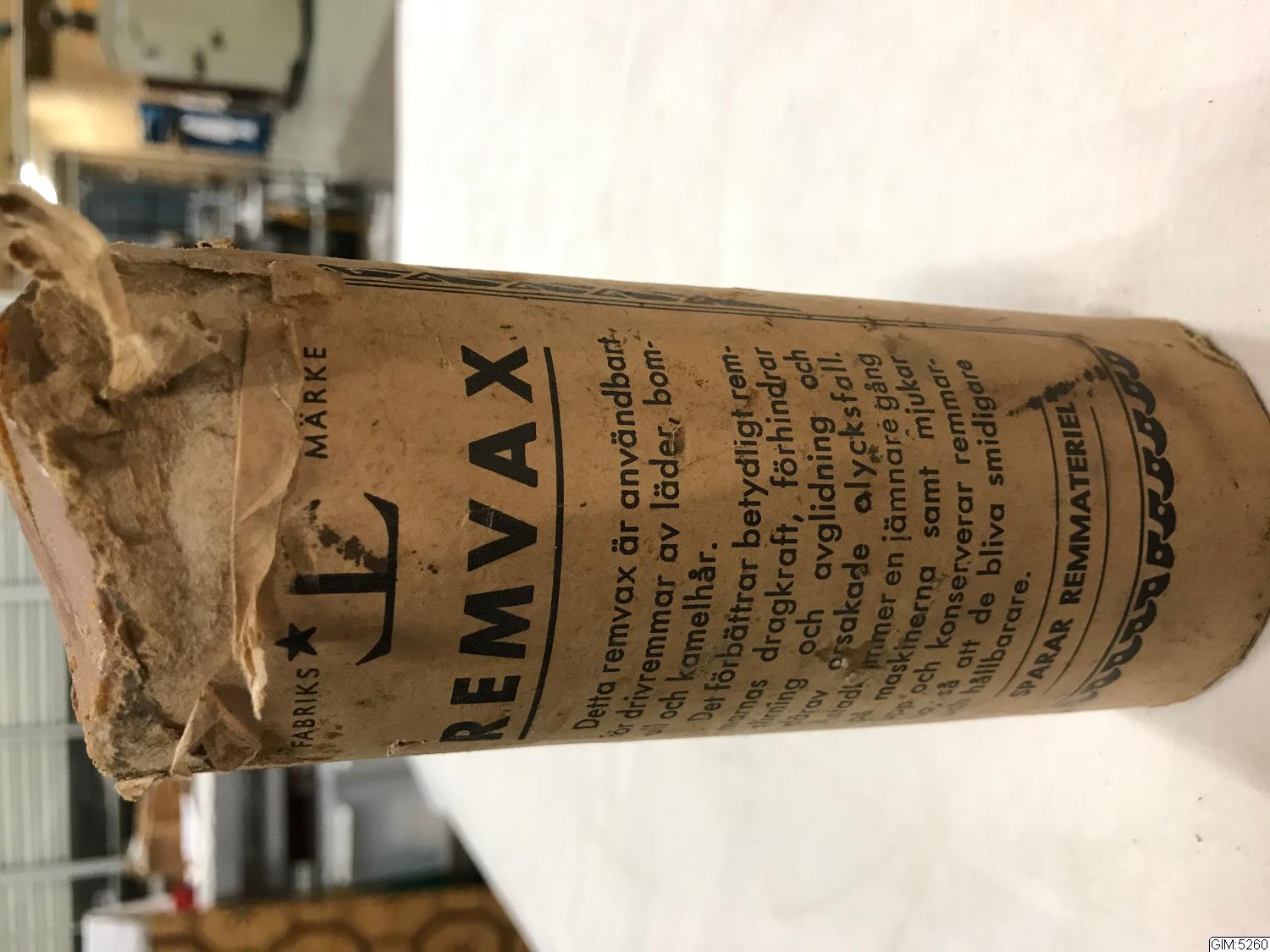 Vax för behandling av drivremmar inslagen i en cylindrisk förpackning av brunt papper, en s k vaxstång. Förpackningen är öppnad och delar av innehållet är använt. På förpackningens framsida står: REMVAX. Detta remvax är användbart för drivremmar av läder, bomull och kamelhår. Det förbättrar betydligt remmarnas dragkraft, förhindrar slirning och avglidning och dräav orsakade olycksfall. åstadkommer en jämnare gång på maskinerna samt mjukar upp och konserverar remmarna så att de bliva smidigare och hållbarare. På baksidan står: BRUKSANVISNING. Avriv så mycket papper från ena stångändan att vaxet blottas ett par cm. Ingnid därmed sedan några ställen på remskivan och sätt maskinen igång. Under gången fördelar vaxet sig jämnt över hela remytan och ger den en utomordentligt förbättrad dragkraft. SPARAR KRAFT.