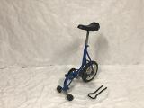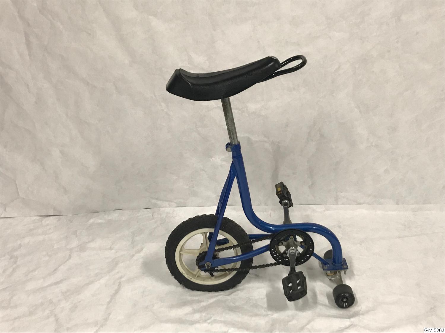 - Specialcykel med ett litet vanligt bakhjul och två små rullhjul fram. Styre saknas. I stället finns ett metallhandtag att hålla sig i. Styrhandtaget sitter löst.