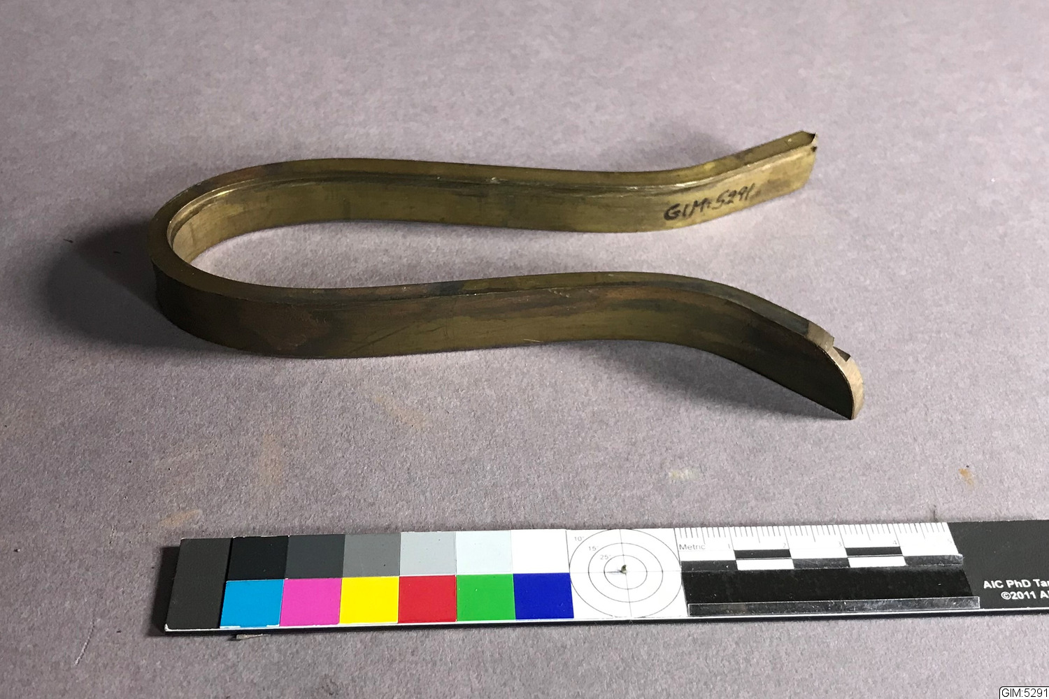 Stämgaffelsliknande föremål i metall och trä, tidigare märkt RekGIM:165. Hör till GIM:5046.