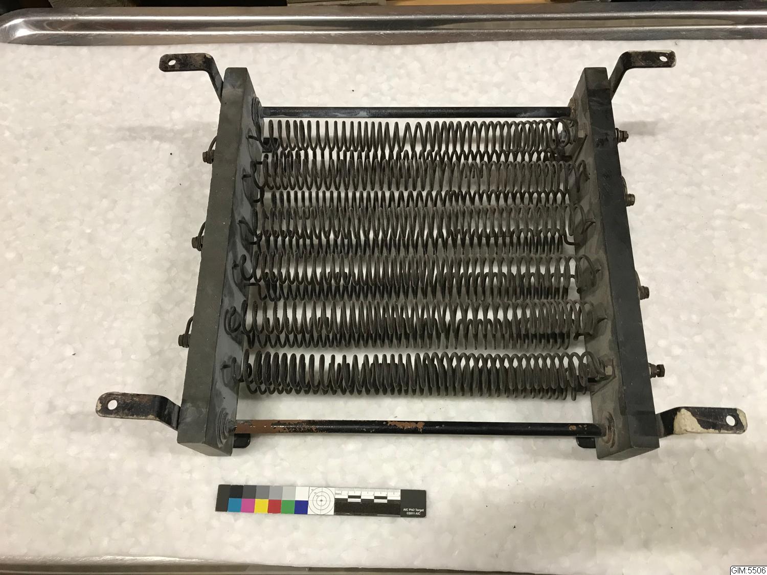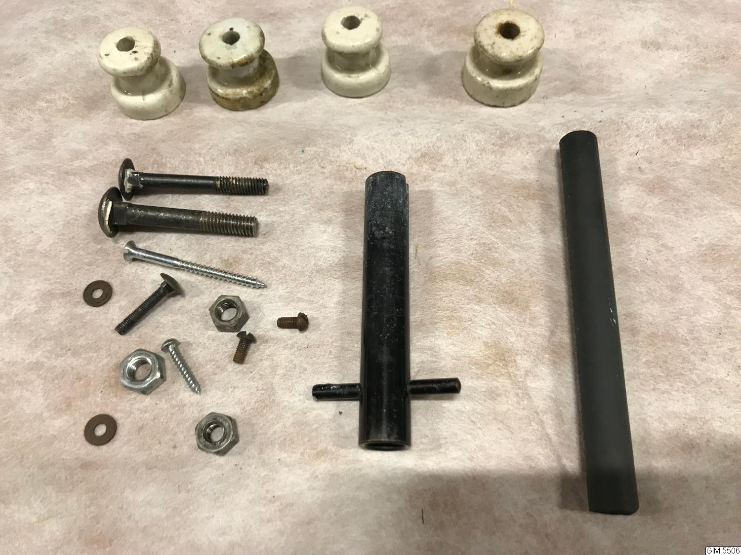 svart plåtlåda, motstånd för lampa, samt låda med skruvar, muttrar, isolatorer i porslin mm.