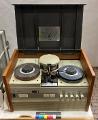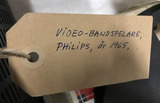 En av de första hemvideorna, rullbandspelare, med radiorör. Endast för svartvit TV, fungerande. Typen användes främst i skolorna. Plastlock, trä och metall hölje.