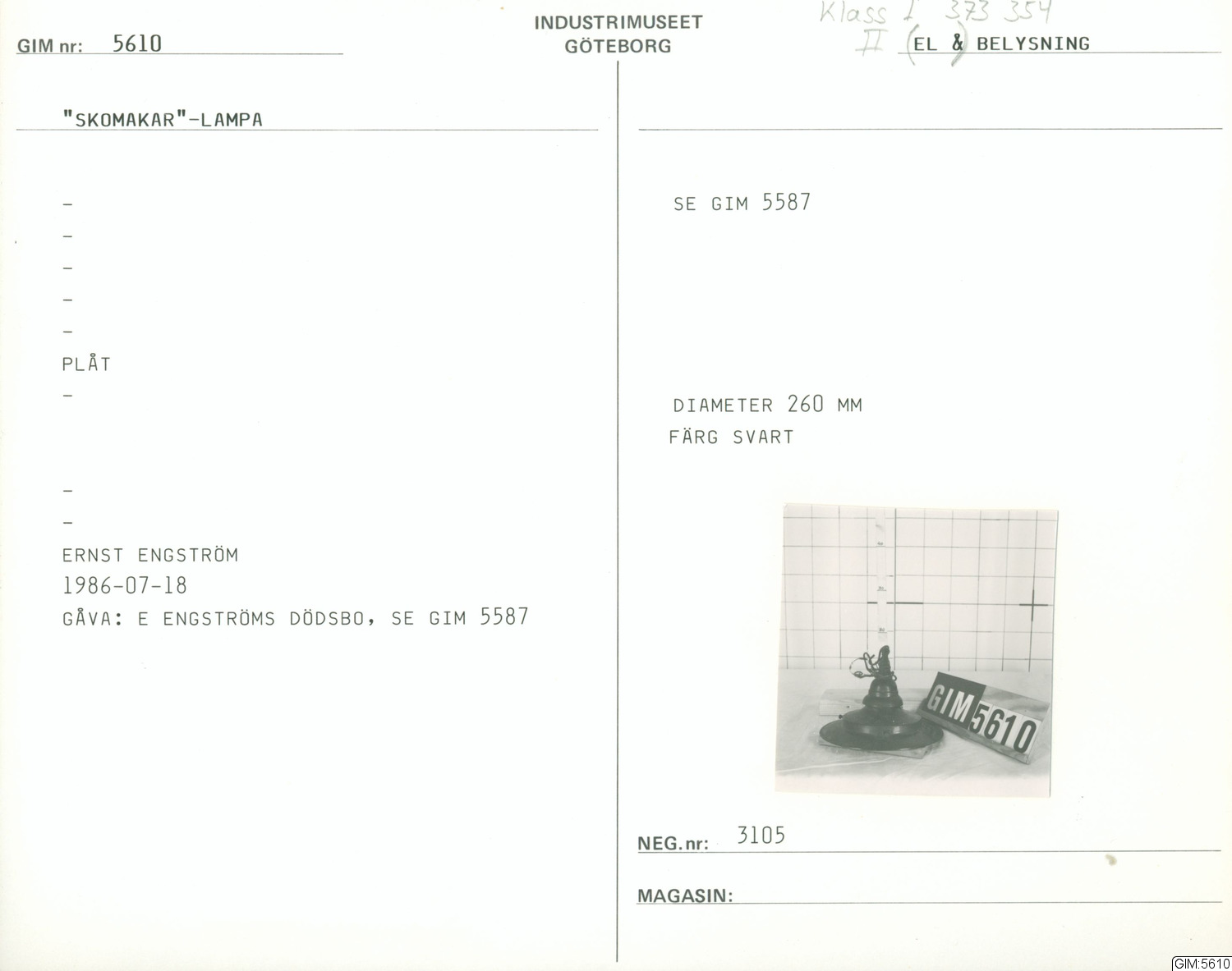 Lampan plockad ur E.E:s verkstad och dödsbo. Han var traktens elektriker och allt i allo, bl a cykelmekaniker. Han verkade fram till 1970. Gåvan skänkt via Åse Johansson