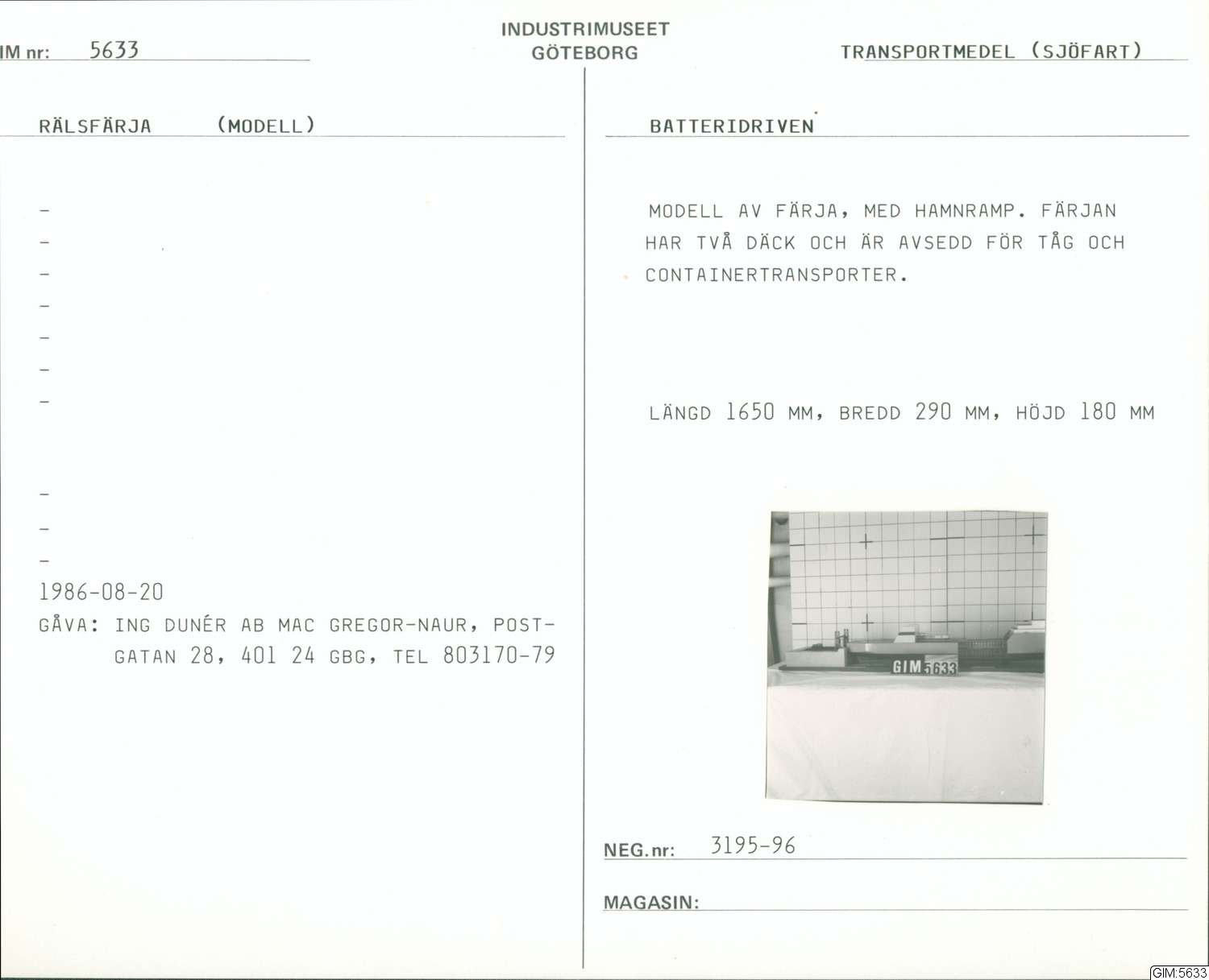 Modell av färjan med med hamnfärjeramp. Färjan har två däck och är avsedd för tåg och containertransporter.