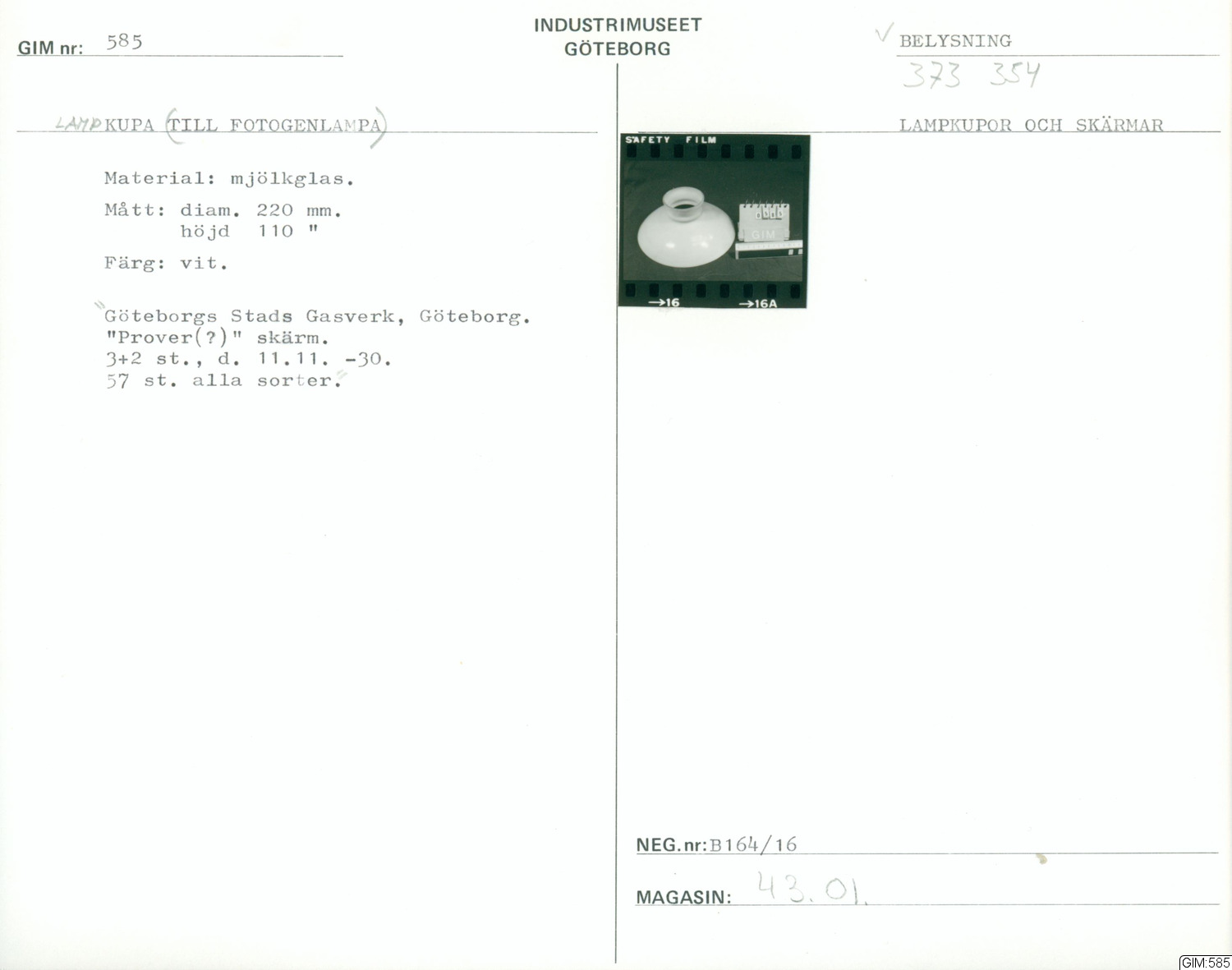 Till fotogenlampa; vulst på halsen; lapp med texten: Göteborgs Stad Gasverk Göteborg; Skarm 3+2st; II.II-30.57 alla sorter.