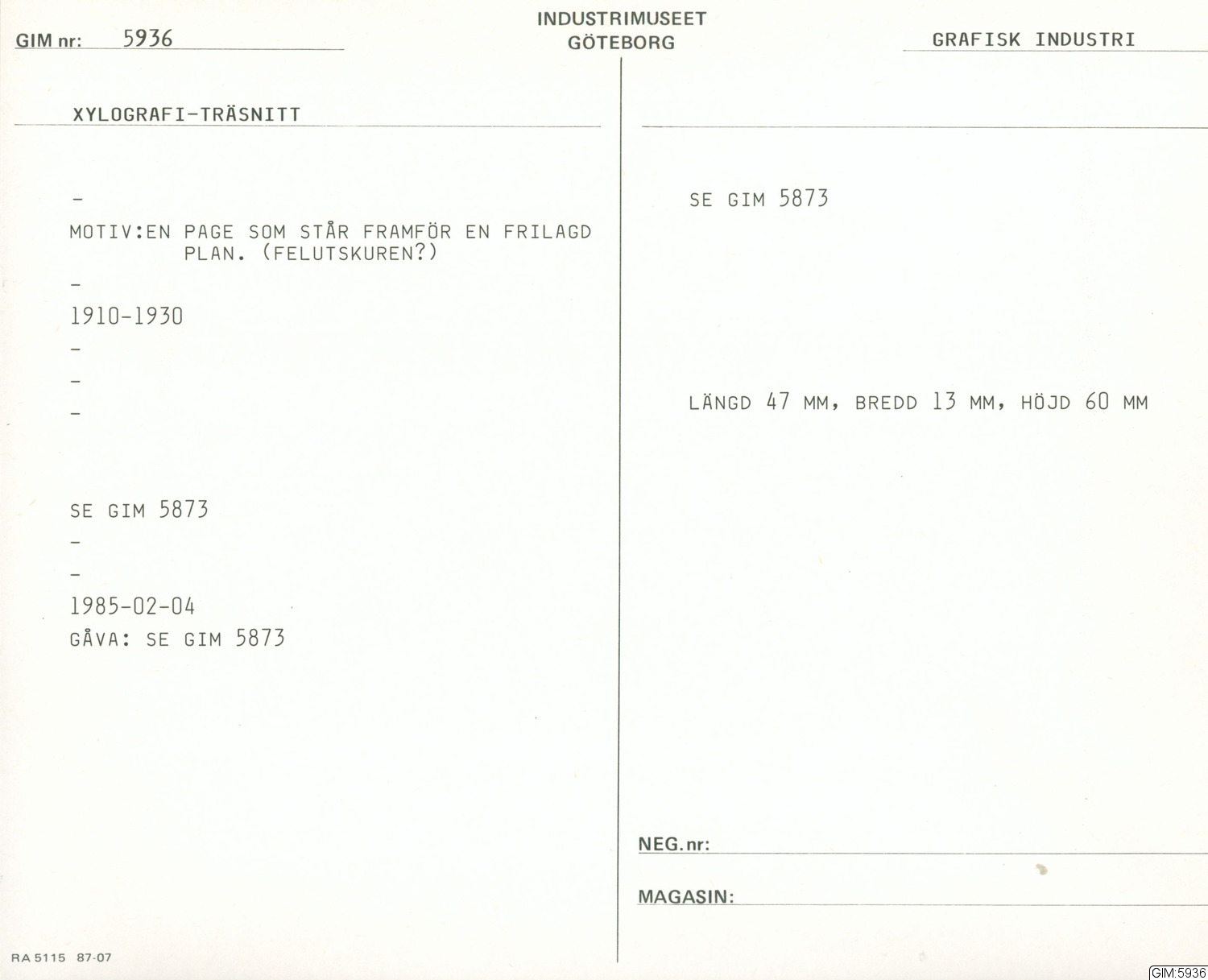 träsnitt=xylografi Motiv: En page som står framför en frilagd plan ( fel utskuren ? )