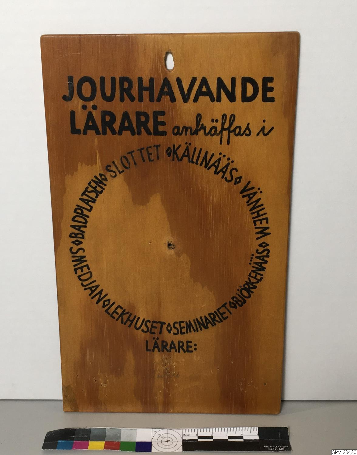 schemaplatta av trä som ger upplysning om var jourhavande lärare befinner sig på skolområdet