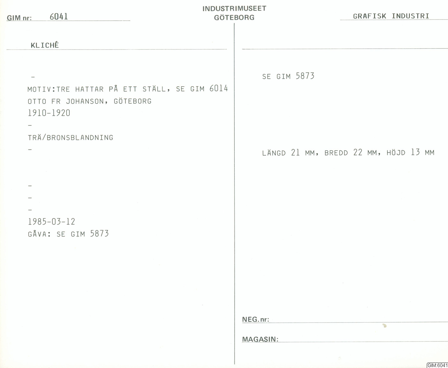 Kliché med motiv av tre hattar som hänger på ett ställ-se GIM 6014.