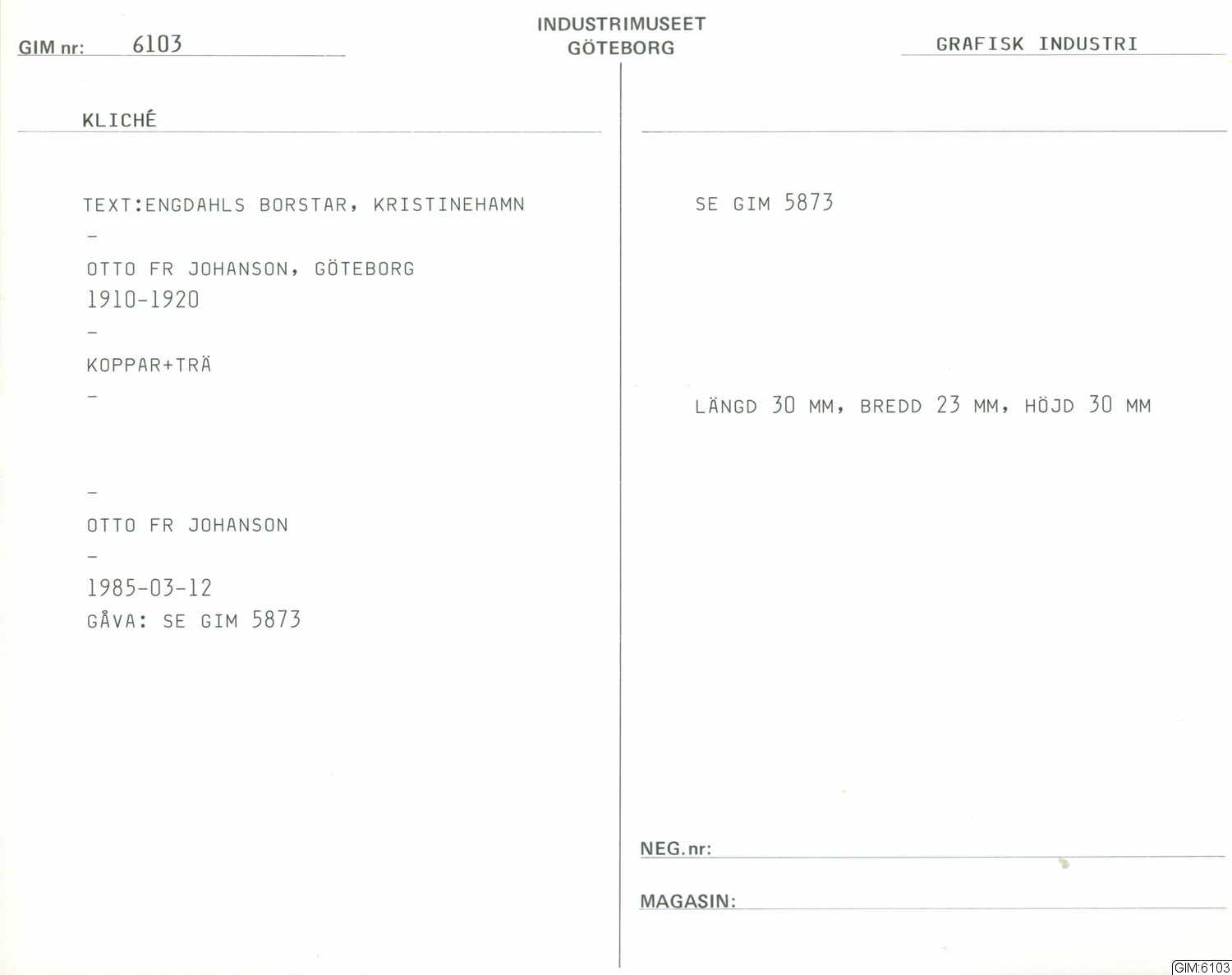 Kliché med texten: Engdahls Borstar, Kristinehamn