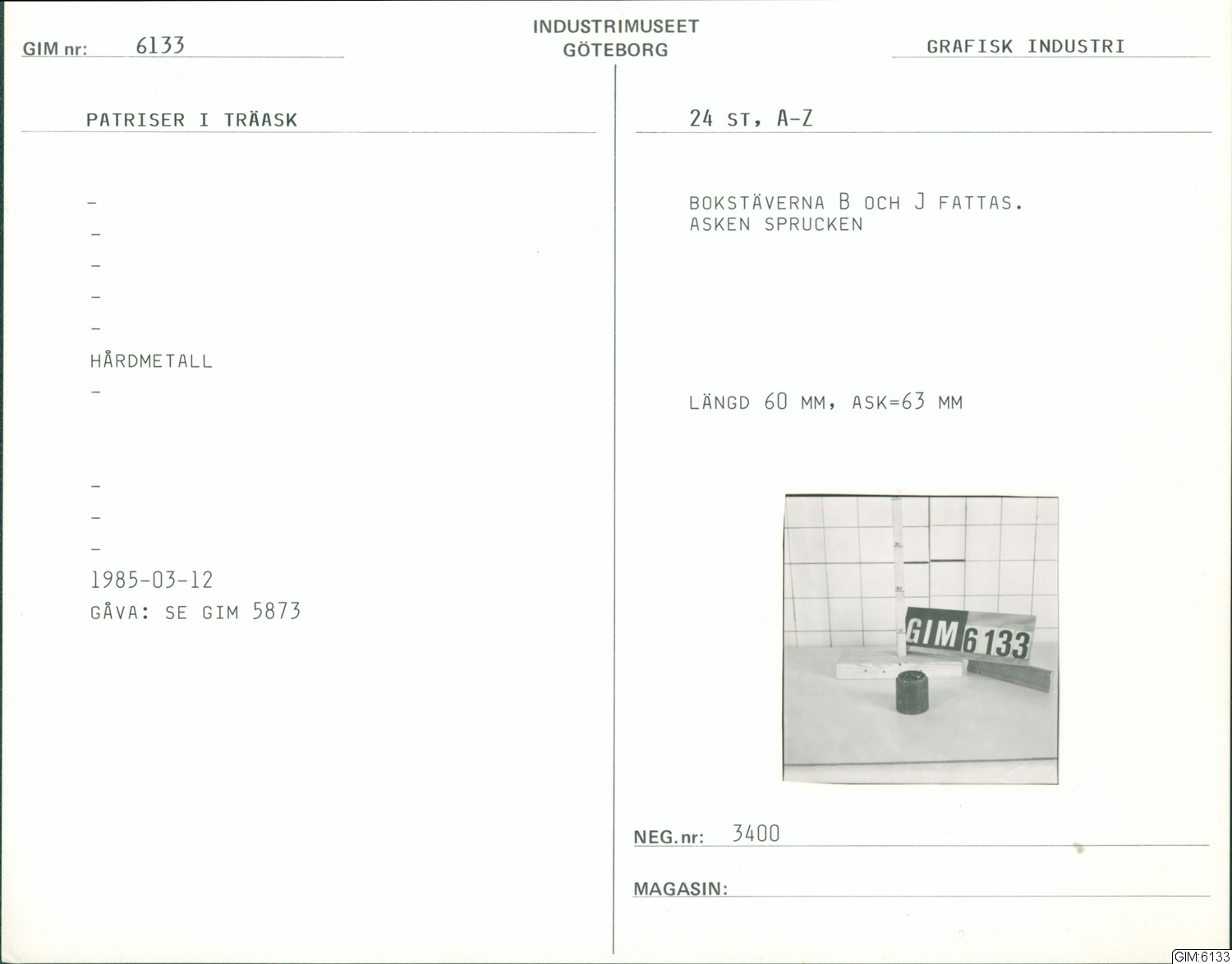 Patriser=punsar. Patriser i träask. Bokstäverna A-Z. Träask= 6,3 cm i diam. B och J fattas. Asken är sprucken.