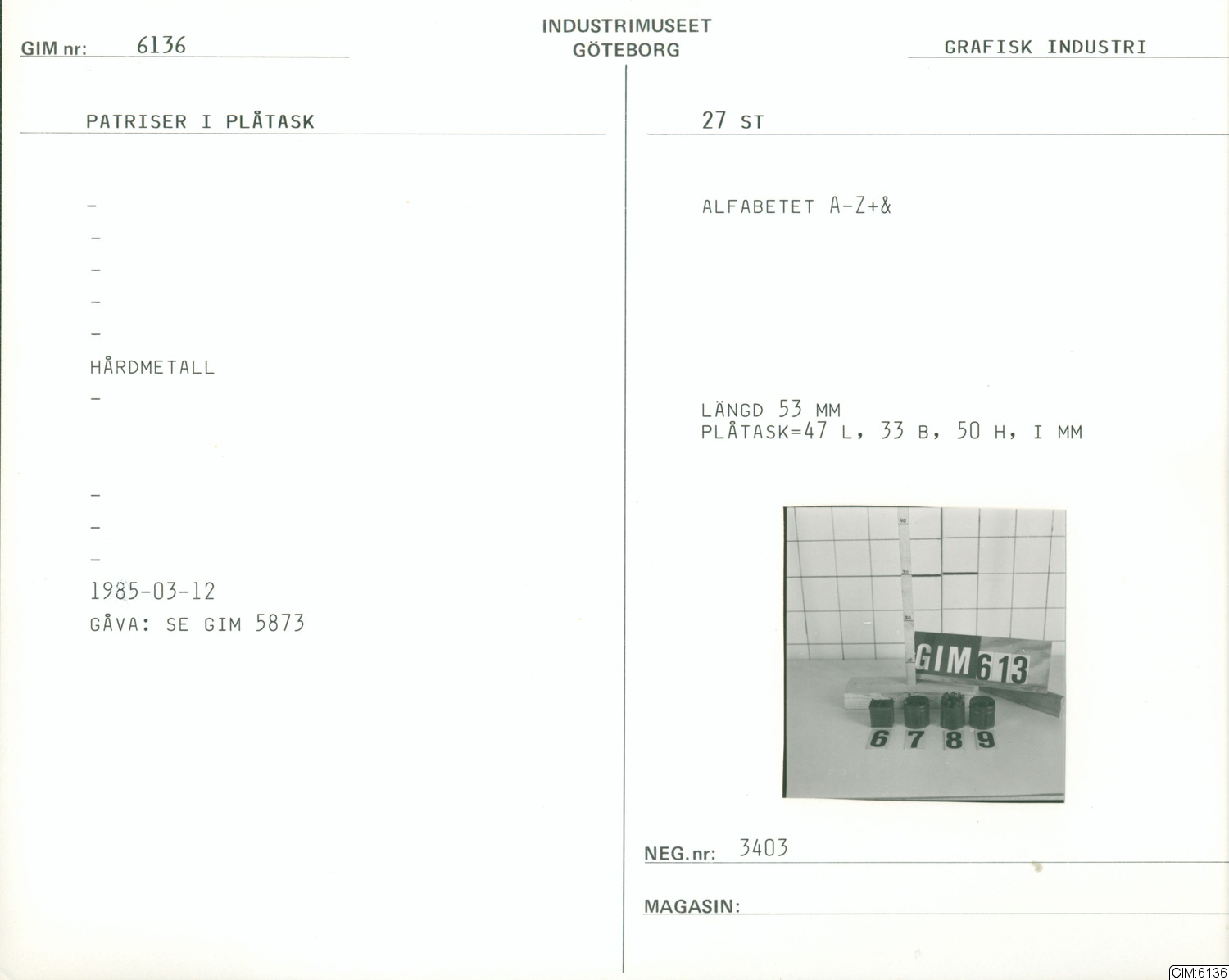 - Alfabetet A-Z+&. Patriser som förvaras i plåtask. Plåtask är 4,7 L- 3,3 B- 5 H cm.