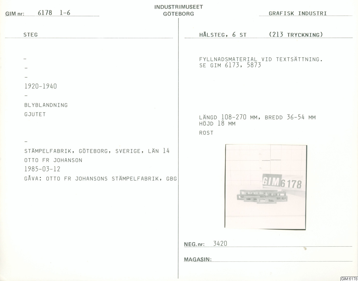 Har använts på Otto Fr Johanssons Stämpelfabrik i Göteborg. Fyllnadsmaterial vid textsättning. Det finns ett antal benämningar på steg bl a slutsteg, kapitälsteg, formsteg, brunsteg beriende på var i sättningen steget placeras.