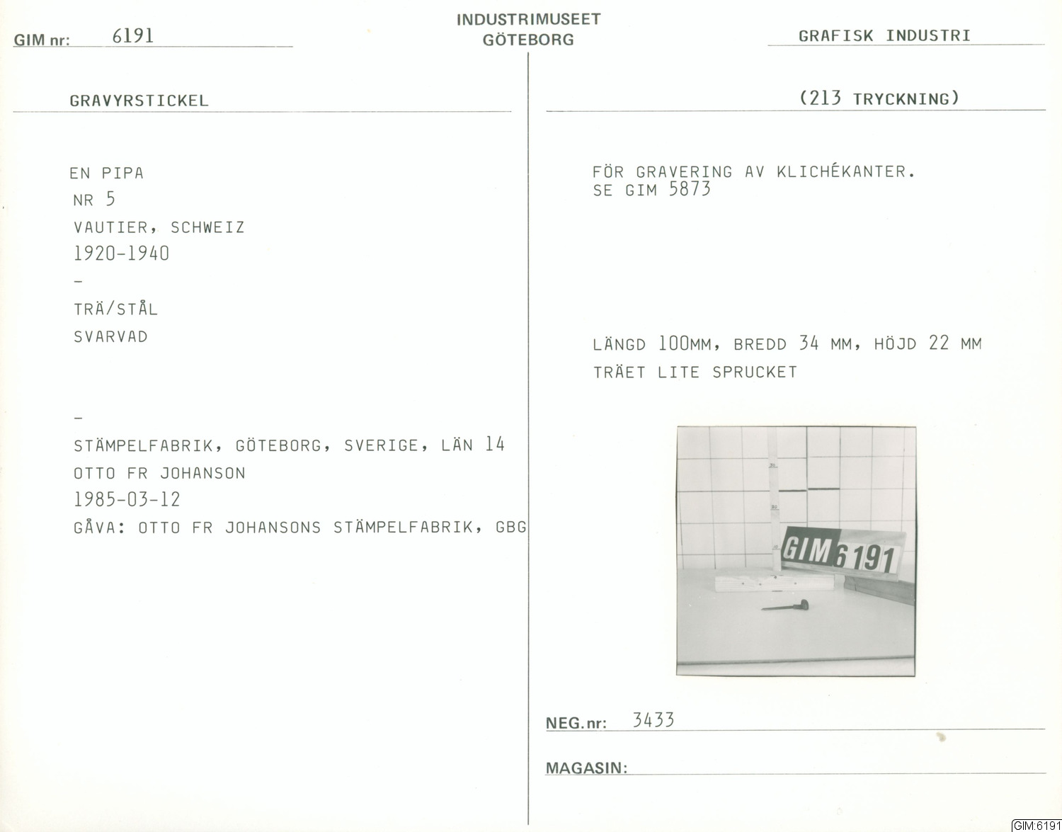 Svarvad gravyrstickel för gravering av klichékanter. Träet är lite sprucket.Signerat och märkt med en pipa.
