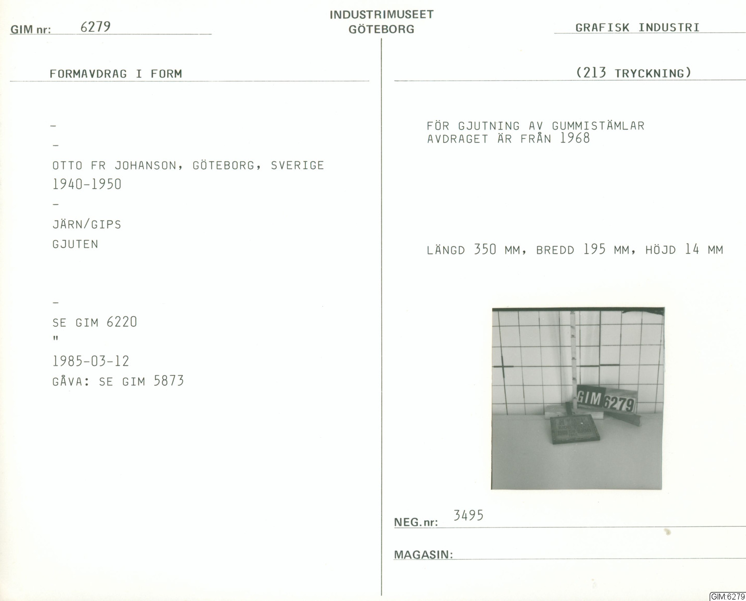 Formavdrag i form för gjutning av gummistämplar. Avdraget är från 1968