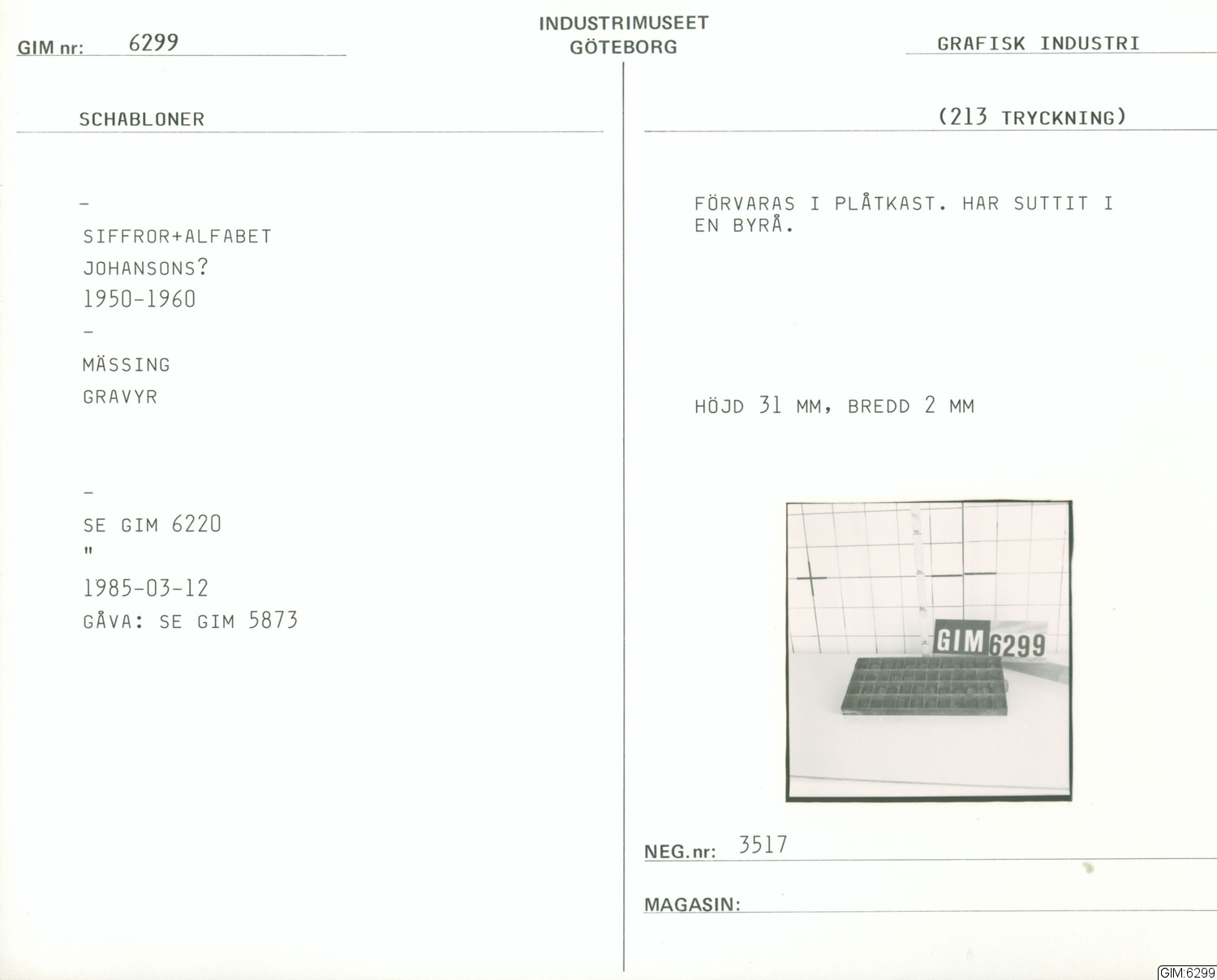 Graverade mässings schabloner föreställande siffror och bokstäver. Förvaras i plåtask. Har suttit i någon byrå.