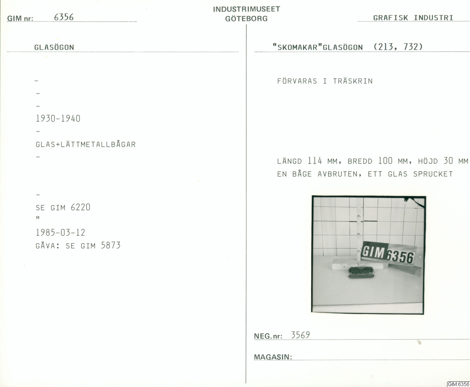 "Skomakar" glasögon. En bäge är avbruten. Ett glas sprucket.. Förvaras i träskrin.