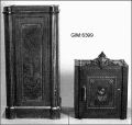 2-delat kassaskåp, brunt ådringsmålat med gulddekor. Överskåpet har 2 svarvade mässingsknoppar och 1 gjutjärnsöverstycke med en mycket avskavd förgyllning. Överstycket har växtornamentik och en "sköld" med tillverkarens namn. Underskåpet är av trä med 3 h