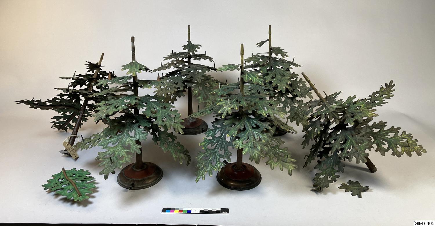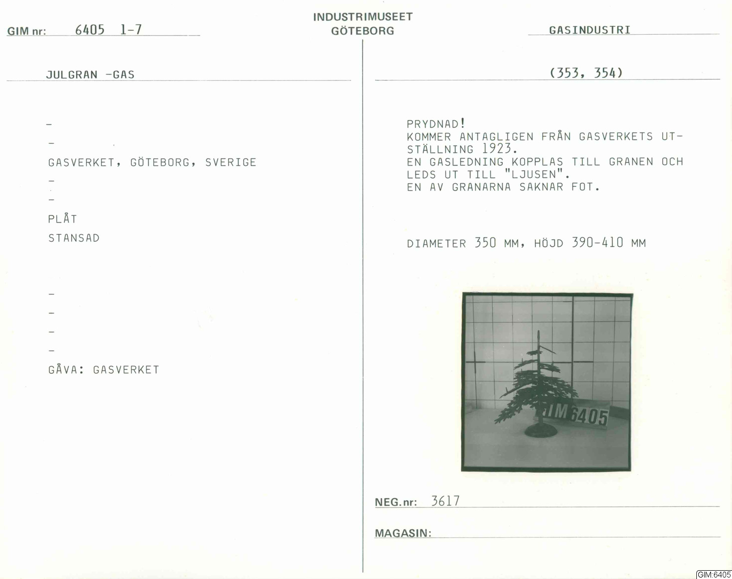 Julgranar, troligen från Gasverkets utställning 1923. En gasledning kopplas till granen och leds ut till "ljusen".