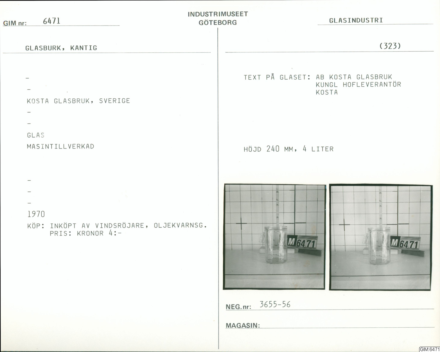 Kantig glasburk. Text på glaset: AB Kosta Glasbruk. Kungl. Hofleverantöe. Kosta. Maskintillverkad