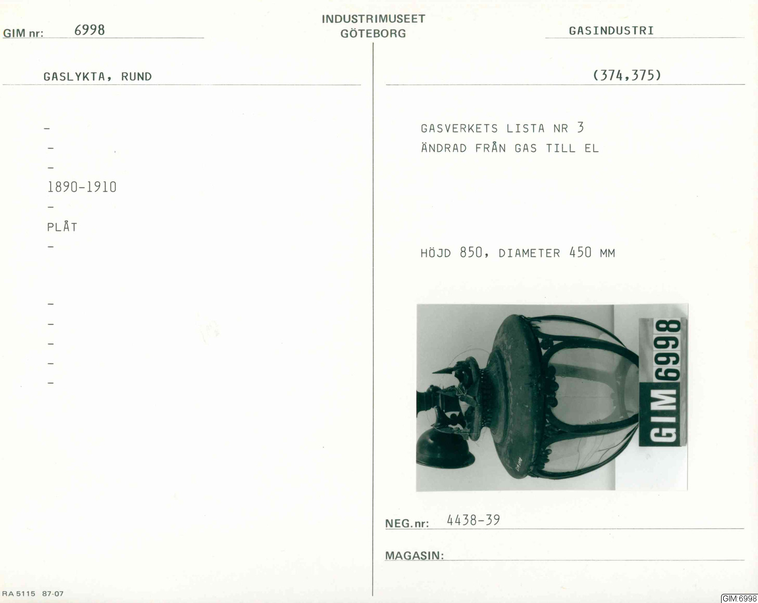 Rund gaslykta. Ändrad från Gas till El.; gas, mm