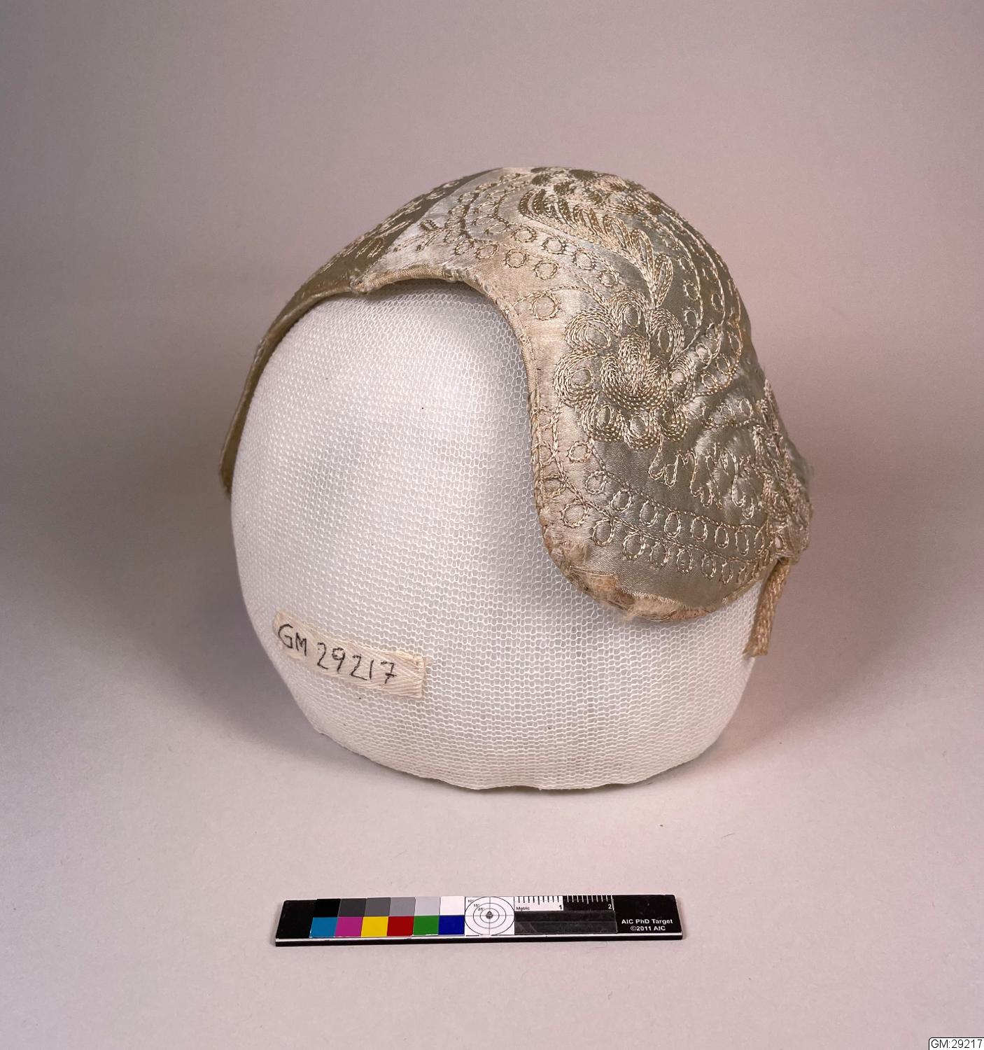 - Bindmössa, mycket ljust himmelsblå/indigoblå, Tambursöms- eller möjligen kedjesömsbroderier i vad som nu är naturvitt/ljust beige. Kan ha varit vitt eller en pastellfärg, i så fall sannolikast samma blå som satängsidenet, det är svårt att vara säker om färgskiftningarna som syns är reflexer av tyget runt om eller spår av ursprungskulör. Bristningar i sidenet vid hjässömmmen närmast nacken och runt mössans kanter, mössan är också deformerad/tillknycklad.