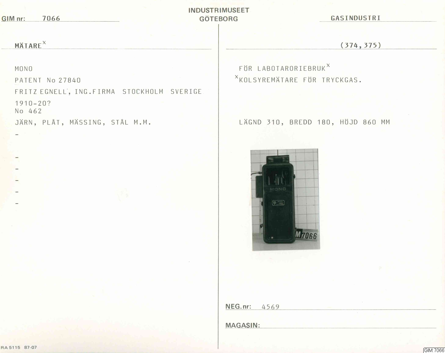 Kolsyremätare för tryckgas, tillverkad av Fritz Egnell ingeniörsfirma i Stockholm.; gas mm