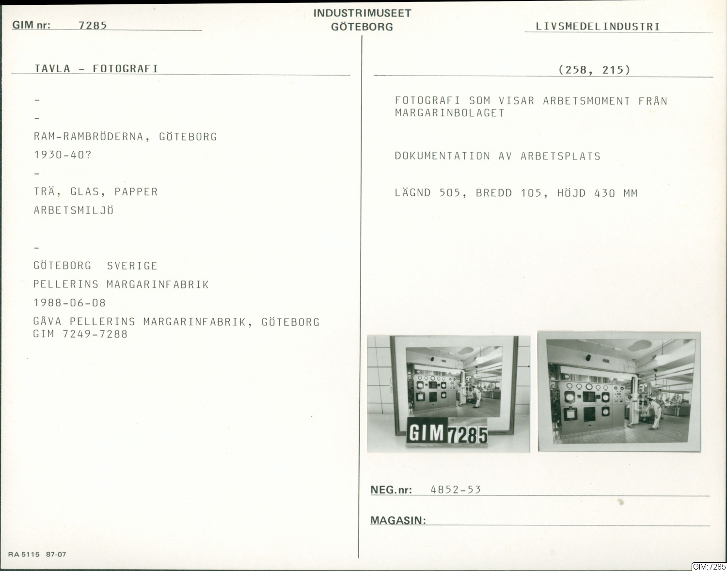 Tavla, fotografi som visar arbetsmoment från Margarinbolaget. Dokumentation av arbetsplats.