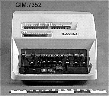 - Elektrisk räknesnurra i grå plåt med svarta respektive röda plastknappar. Firmanamnet Facit är fastsatt på framsidan på mörkgrå plastskylt med vit text samt på baksidan med separata grå bokstavsskyltar med vit text. Design Sigvard Bernadotte.