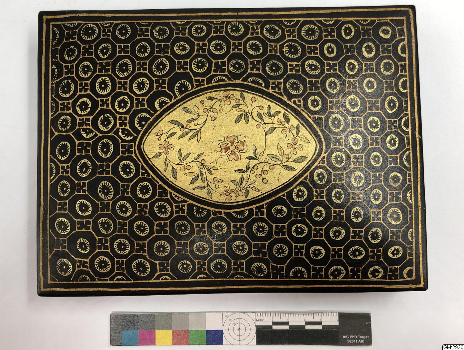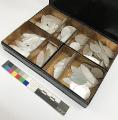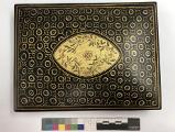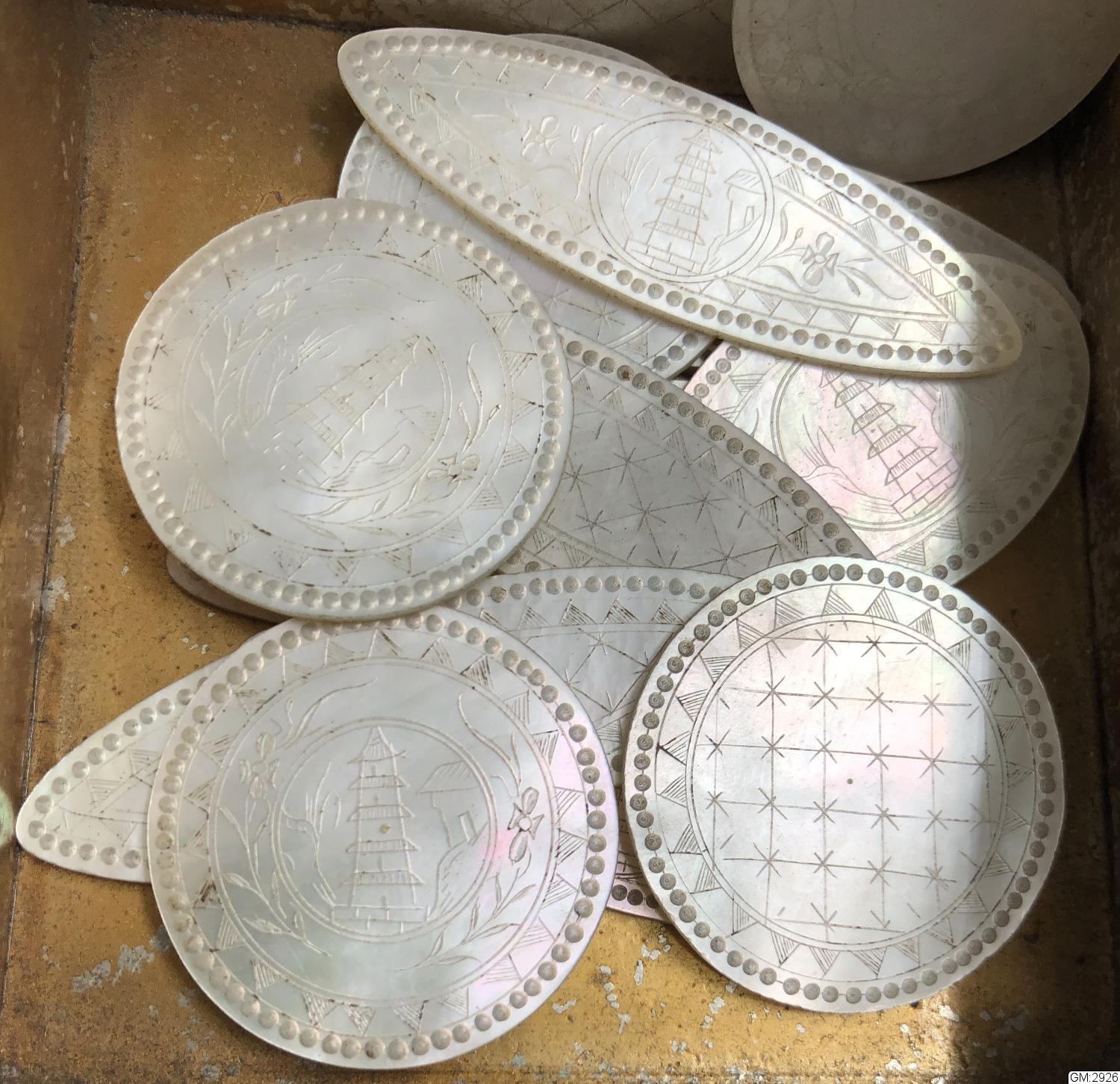 Spel, spelbrickor av pärlemor, ligger i metallask