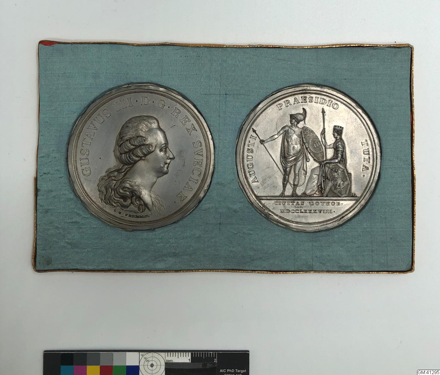 - medaljavslag, av båda sidorna, från- och åtsida av den medalj som 1788 slogs, i guld, silver eller brons, som minne av att Gustaf III ansågs ha räddat Göteborg från danskt anfall och erövring. Monterade, samtida ca 1788-90, på en platta klädd med blått siden, avsedd att inramas.