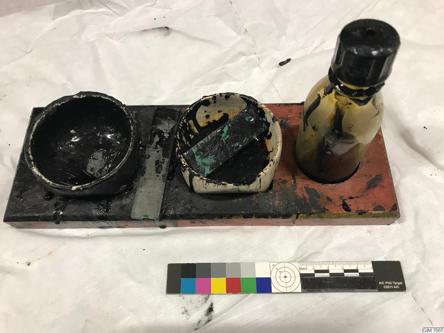 bräda med utsågade platser för 1 terpentin- flaska och 2 porslinskålar; 2 st delobjekt, brädan har delobjektnummer 1 och glasflaskan nummer 2.