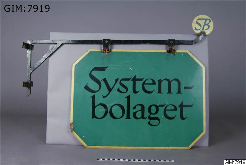 Grönlackerad metallskylt "Systembolaget", på hängare av smidesjärn, rund metallplatta "guld" märkt SB.