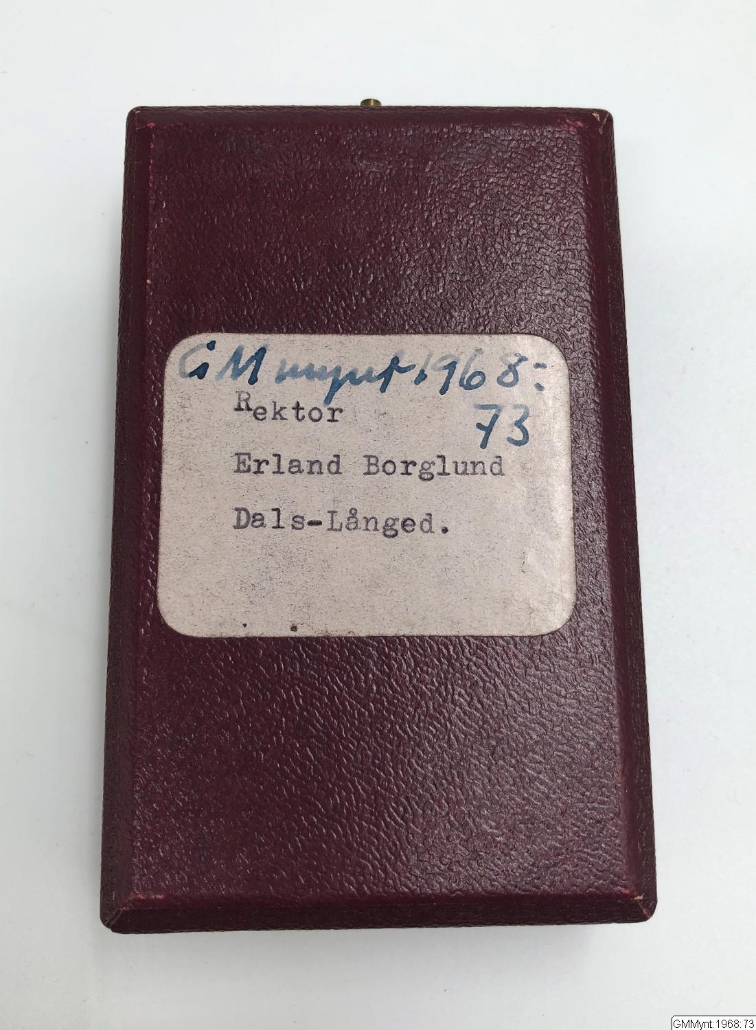 - etui samt medalj, Svenska Hemslöjdsföreningarnas Riksförbunds förtjänstmedalj i silver, tilldelad 1946. Vinrött etui, med guldtryck på locket, från Kungl. Myntverket med etikett klistrad undertill, "Rektor Erland Borglund, Dals-Långed." Borglind erhöll samma medalj men i guld år 1954.
