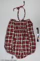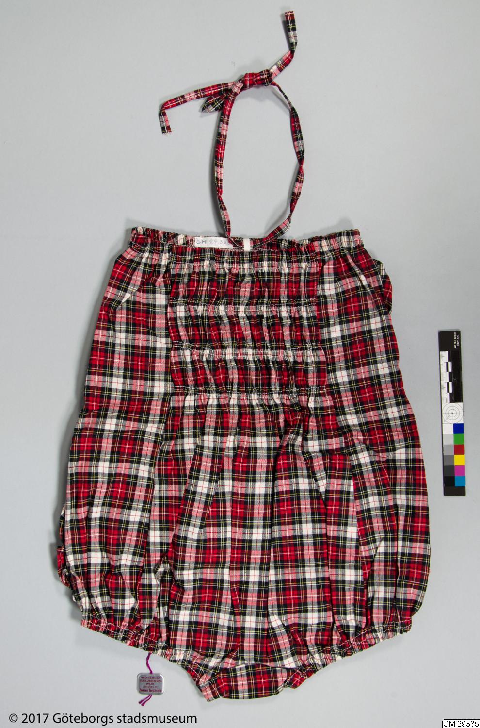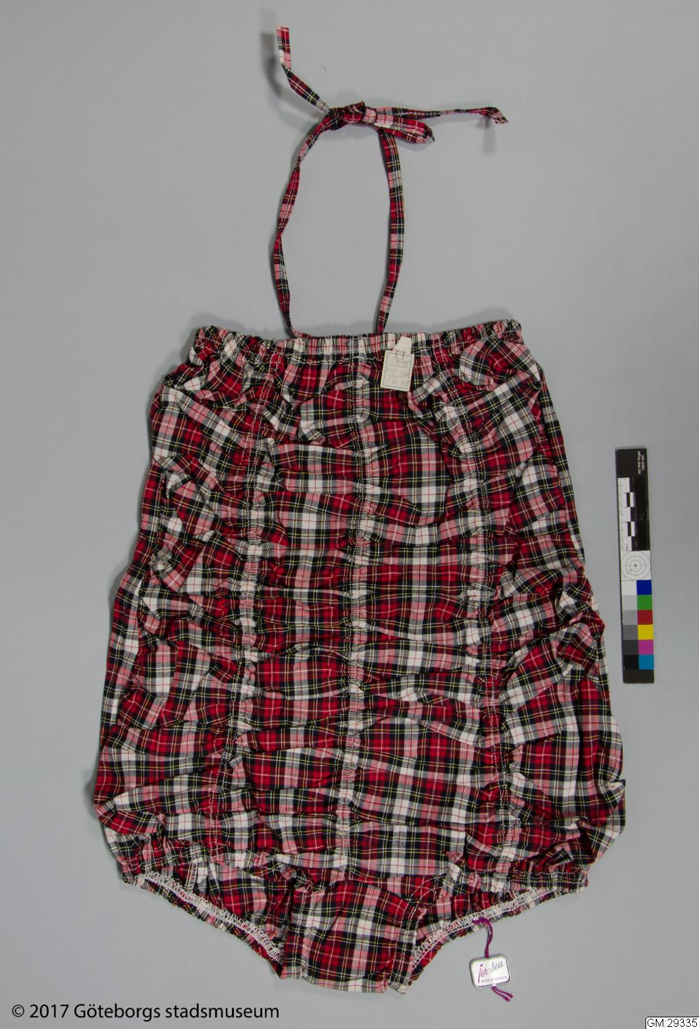 Baddräkt f. flicka. L. 40 cm. Skotskrutigt bomullstyg genomdraget med resårer. Knytband runt halsen.